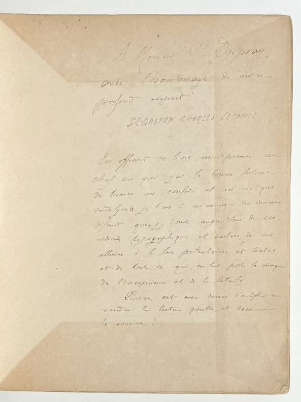 Edition originale sur papier courant. Rare envoi autographe signé de Sebastien-Charles Leconte. Dos passé comportant de petites restaurations avec très légers manques en tête et en pied, agréable état intérieur. - Photographies et détails sur www.Edition-Originale.com -
