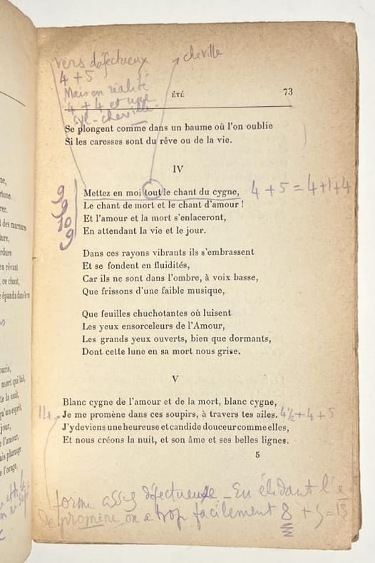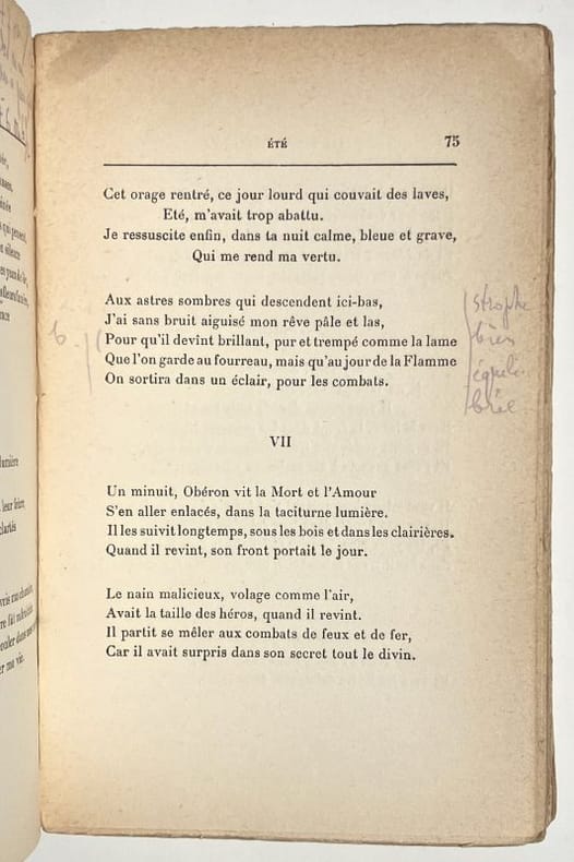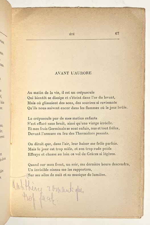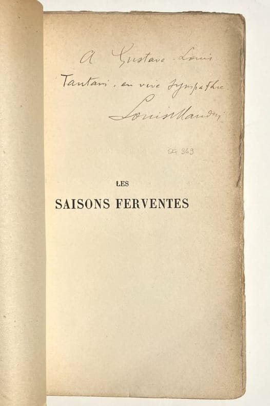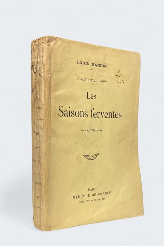 Édition originale. Envoi autographe signé : « à Gustave-Louis Tautain, en vraie sympathie ». Futur directeur de la revue Le Monde nouveau, ce dernier a porté quelques annotations au crayon violet dans les marges, moins sympathiques que la dédicace : « antithèse romantique trop facile », « image mal équilibrée », « vers défectueux »... Ces débuts laborieux n'empêchèrent pas l'auteur de devenir un poète reconnu, adoubé entre autres par Paul Léautaud. Dos abîmé et recollé sans finesse.