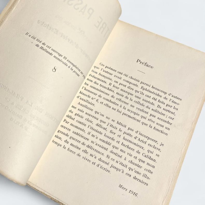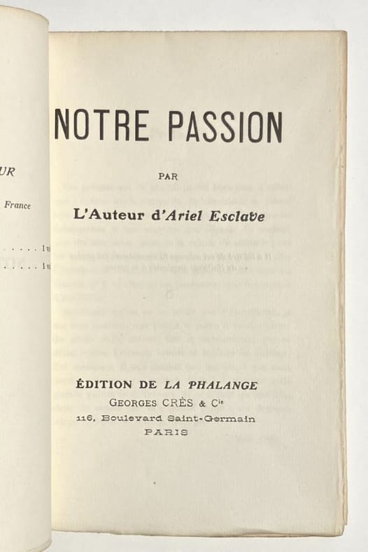 Louis Mandin publiait dans la presse des poèmes émouvants sur la guerre. Ne trouvant aucun éditeur, il les fit imprimer à ses frais en juillet 1916, sans son nom, sous le titre : “Notre Passion, par l'auteur d'« Ariel esclave »”. Il se résigna à réduire le volume, qui ne fut plus qu'une forte plaquette. Son ami Jean Royère lui prêta la marque “la Phalange”, et un éditeur, M. Crès, consentit à prendre le volume en dépôt... En 1920, une version plus complète, avec les poèmes inédits et augmentés de ceux écrits au front sera publiée à la Renaissance du Livre. — "Louis Mandin est né le 14 avril 1872 : il vient à Paris, on le rencontre dans les milieux littéraires, attentif et timide. Mais il a déjà des amis, des admirateurs. Et Valette le prendra comme secrétaire de la rédaction au “Mercure de France”. La guerre de 1914 éclate. Un écrivain, à qui il répugnait de porter les armes pour la défense de son pays, lui reproche un livre de poèmes qui exaltait les combattants. Le lendemain, Mandin, cet homme de quarante-deux ans qui a craché le sang pendant toute sa jeunesse, se présente devant le conseil de révision et sollicite un engagement dans le service armé. On le repousse. Il va trouver un de ses amis, Guy Lavaud, alors attaché parlementaire du général Galliéni ministre de la Guerre. En vain son ami le supplie-t-il de mépriser une injure trop basse pour être relevée et lui rappelle-t-il sa faiblesse physique. De guerre lasse, il intervient et obtient l'incorporation de Mandin dans le service auxiliaire, étant bien spécifié que cela n'ira pas plus loin. Mais c'était mal connaître ce caractère. Persécuté, partout où il passa, par des camarades, eux aussi auxiliaires, et qu'offensait son entêtement à combattre, il devient mitrailleur à Verdun et traverse cet enfer dans une sorte d'exaltation joyeuse, priant que la mort choisît pour une cause sainte sa fragile dépouille, écrivant aussi des vers sous les obus et les feux des mitrailleuses..." (Anthologie des écrivains morts à la guerre 1939-1945, 1960)
