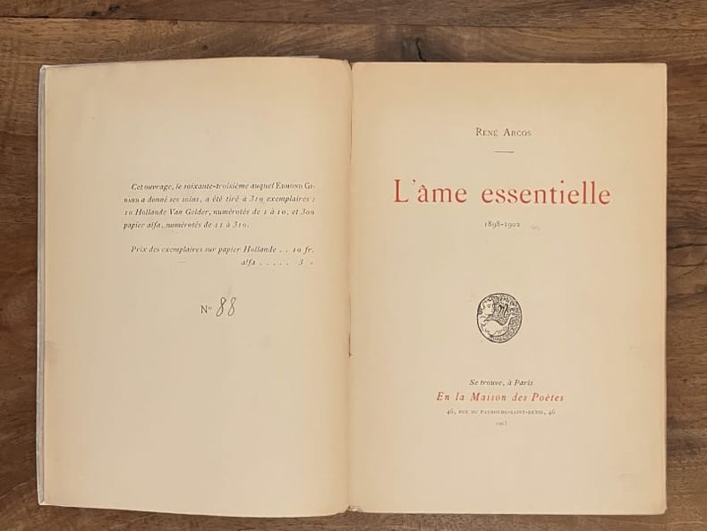 Paris En la Maison des Poètes 1903 153 pp. In-12. Broché. Etat correct. 1 volume. TIRAGE LIMITÉ. Un des 300 exemplaires numérotés sur papier alfa.