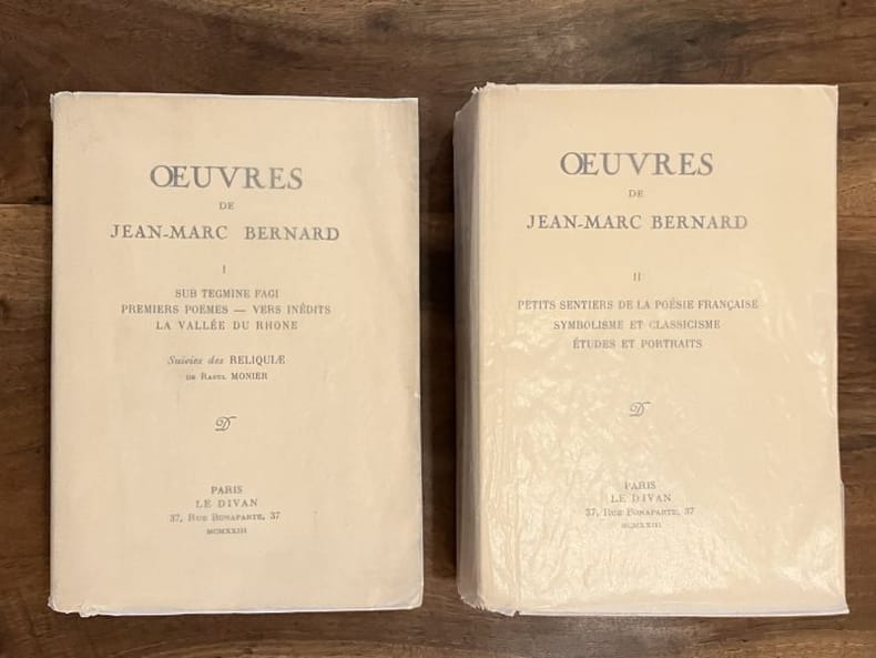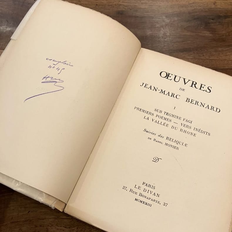 Édition collective posthume, en partie originale, établie par Henri Clouart. Elle renferme aussi les Reliquiae de son ami Raoul Monier, mort au front comme Jean-Marc Bernard. Un des 150 exemplaires sur pur fil Lafuma, justifié n° 45 au crayon. Très bon exemplaire.