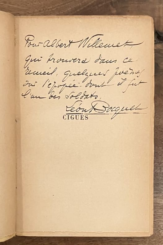 Première édition collective, en partie originale. ENVOI AUTOGRAPHE SIGNÉ : « Pour Albert Willemet, qui trouvera dans ce recueil quelques poèmes sur l'épopée dont il fut l'un des soldats. » Couverture défraîchie, papier bruni.