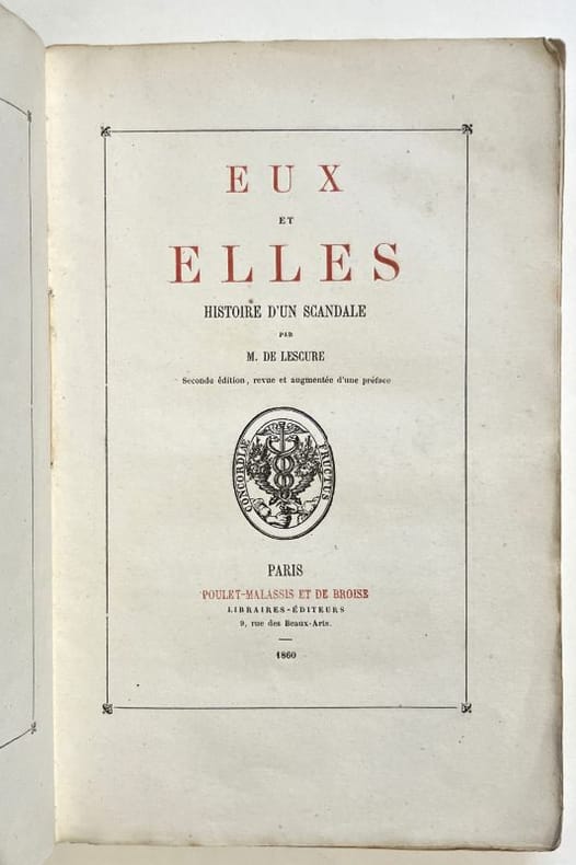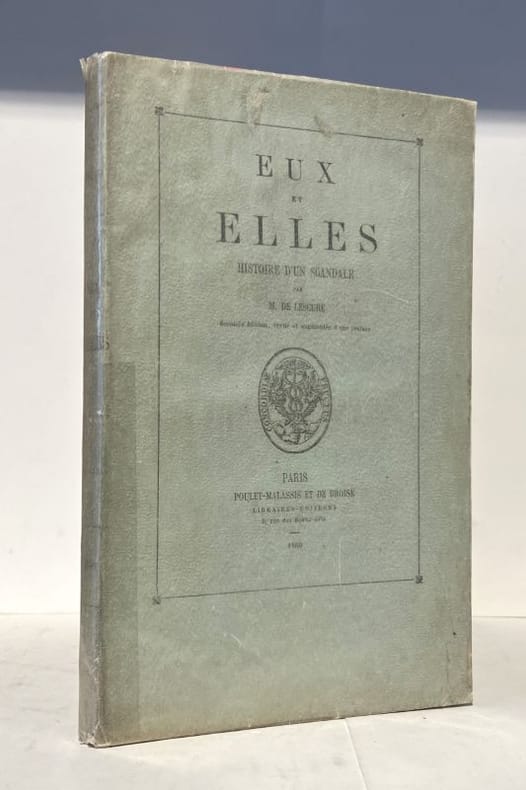 Seconde édition, revue et augmentée d'une préface ; elle parut quelques mois seulement après la première, vite écoulée. Spécialiste des chroniques scandaleuses du XVIIIe siècle, Adolphe de Lescure fit une incursion dans la littérature contemporaine pour éreinter George Sand (Elle et Lui), Paul de Musset (Lui et Elle) et Louise Colet (Lui). Dos fendu, néanmoins bon exemplaire conservé broché (sous papier cristal).