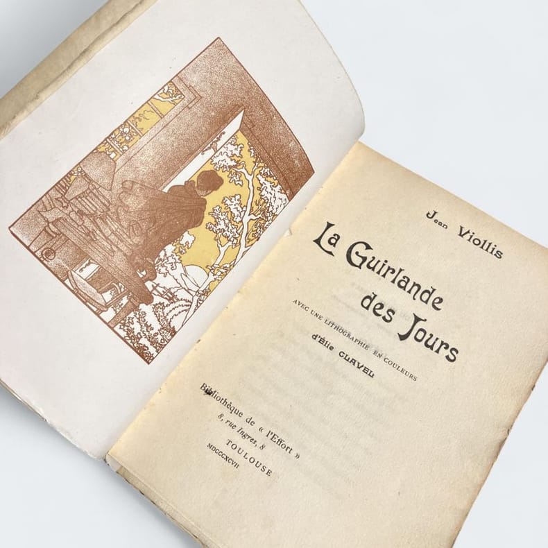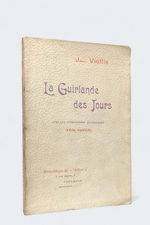Bibliothèque de ""L'effort"", Toulouse 1897. Un volume broché (13 x 20 cm) de 48 pages. Ouvrage illustré d'une lithographie originale en couleurs d'Elie Clavel. Couverture un peu roussie, sur la page de garde signature de l'auteur mais nom du destinataire de l'envoi découpé. Édition originale du premier ouvrage de l'auteur.