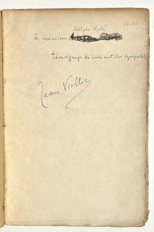 Jean Viollis, La Guirlande des Jours [avec une lithographie en couleurs d'Elie Clavel]. Toulouse, Bibliothèque de « l'Effort », 1897. In-8, 48-[2]p. Edition originale du premier ouvrage de Jean Viollis, tirée à 520 exemplaires dont 20 japon, 250 hollande et 250 « bulle fort », le nôtre étant le n°19 sur papier hollande. Exemplaire enrichi d'un envoi à l'écrivain Jules Renard : « à monsieur Jules Renard / hommage bien sympathique / Jean Viollis » et une notre autographe sur le feuillet suivant « "Enfin, j'ai un idéal : la pâleur de mort / teint et ma tristesse en répondent." / L'Ecornifleur », citation tirée donc du roman de Jules Renard. Exemplaire enrichi de petits coups de crayon bleu de Jules Renard. Une croix sur la couverture, indiquant qu'il a répondu à l'auteur, et des vers ou passages marqués en marge, probablement en vue d'une critique. Notons que l'amitié entre Viollis et Renard est importante. Jules Renard, entré à l'Académie Goncourt en 1907, présente dès 1908 un roman de Viollis pour le prix, Monsieur le Principal. Il obtiendra 5 voix, comme Miomandre, et ce dernier aura le Goncourt car il avait la voix du président, Léon Hennique. Broché, non rogné. Couverture décollée du corps d'ouvrage, papier sali en bordure. Bon exemplaire. [XI]