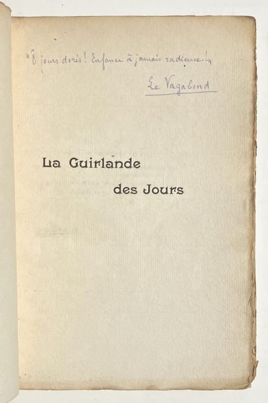 Édition originale du premier recueil de Jean Viollis, « guirlande, un peu frivole, d'une adolescence studieuse et contemplative » (l'auteur avait 19 ans). Elle est ornée d'une belle lithographie en couleurs d'Élie Clavel en frontispice, dans le style Art nouveau. Un des 250 exemplaires sur Hollande, après 12 Japon. Envoi autographe biffé, mais le nom du destinataire reste déchiffrable : il s'agit du poète symboliste Adolphe Retté (1863-1930). L'auteur a aussi inscrit ce vers à l'encre violette sur le titre : « Ô jours dorés ! enfance à jamais radieuse ! », extrait du poème Le Vagabond de Retté. Dos recollé, dernier feuillet bruni.