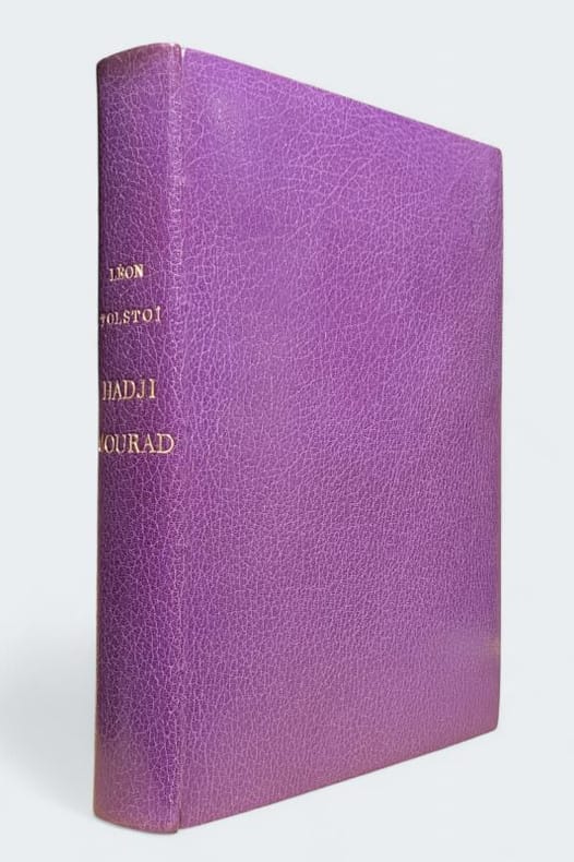 Édition de luxe ornée de 31 lithographies originales en couleurs de Kostia Terechkovitch (1902-1978), dont la couverture, le frontispice et 13 compositions à pleine page. Traduit en français par Théodore de Wyzewa, ce récit a pour héros le chef avar Hadji Murad (1795-1852), un des opposants à la conquête russe du Caucase. Tirage à 125 exemplaires numérotés sur papier vélin d'Arches, celui-ci enrichi d'une suite des lithographies sur papier Japon ancien. SUPERBE EXEMPLAIRE EN RELIURE TRIPLÉE DE SEMET & PLUMELLE, d'une belle teinte violette. La doublure bord à bord, qui requiert une grande habileté, est d'une exécution parfaite. Dos de la chemise légèrement passé.