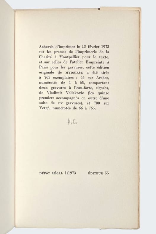 Un des 65 exemplaires sur Arches numérotés de 1 à 65 comportant deux gravures à l'eau-forte, signées, de Vladimir Velickovic (n° 41), 1 vol. in-8 en feuilles sous couverture rempliée, Fata Morgana, Montpellier, 1973, 62 pp. avec 4 dessins hors texte (dont 2 sur calque et 2 eaux-fortes numérotées et signées par l'artiste).