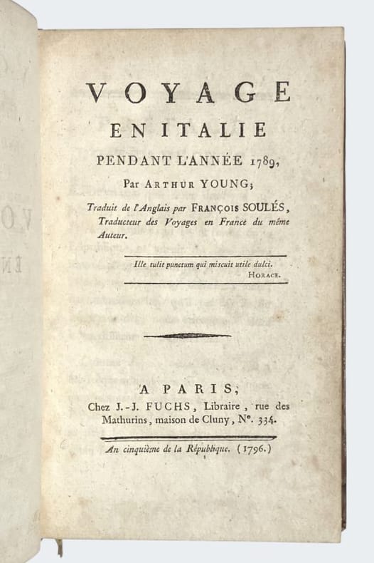 Première traduction française : c'est à la suite de son troisième voyage agronomique en France, celui commencé en juin 1789, qu'Arthur Young (1741-1820) passa en Italie par Toulon, avec le même but d'observation que dans ses périples antérieurs. Son séjour se résuma surtout à deux semaines passées à Florence, et fut notablement plus bref et plus superficiel que les autres : en janvier 1790, il était de retour à Paris.Bel exemplaire. - - VENTE PAR CORRESPONDANCE UNIQUEMENT - LIEN DE PAIEMENT, NOUS CONSULTER.