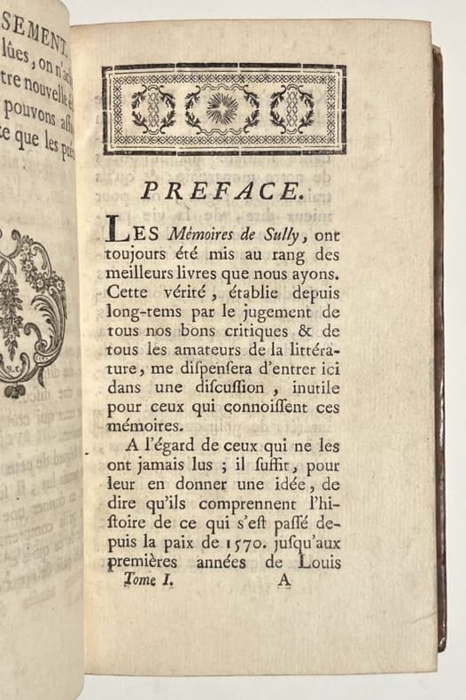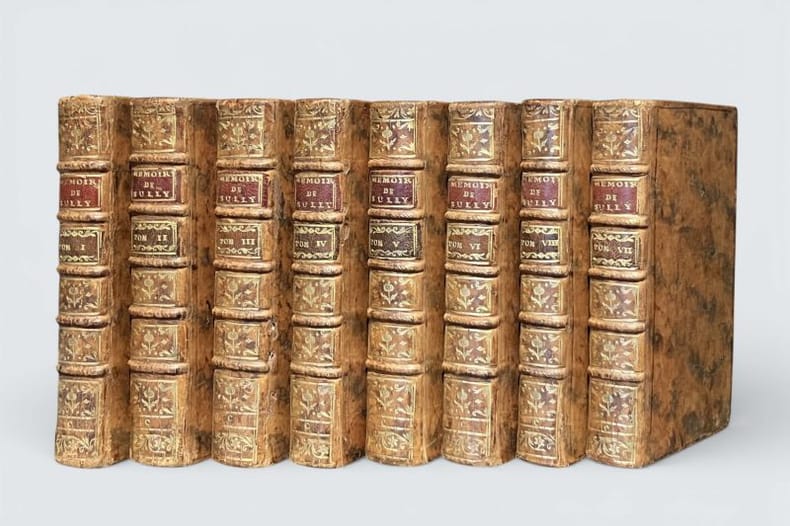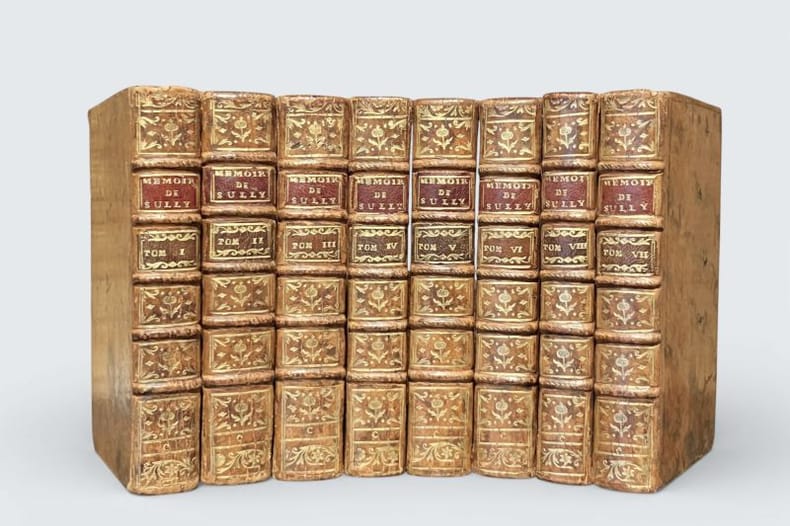 Londres, 1778, 8 vol. in-12, 447, 473, 463, 456, 424, 405, 440 et 442 pp, avec en frontispice du premier volume, un portrait de Henri IV d'après Boizot et un autre de Sully gravé par Fessard, bandeaux, lettrines, culs-de-lampe, notes de l'abbé de l'Écluse des Loges, tables des noms dans chaque volume, reliures plein veau marbré, dos lisses à caissons fleuronnés dorés, pièces de titre et de tomaison chagrin carmin et noir, tranches rouges (rel. de l'époque), dos lég. frottés, qqs coiffes arasées, bon état