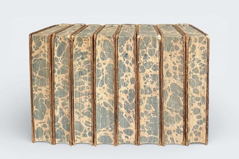 1763 Londres, 1763 ; 8 vol. in-12, veau marbré dos à nerfs ornés de caissons de fleurons dorés, pièces rouges et brunes, initiale C dorée en pied, tranches marbrées (reliures de l'époque).
