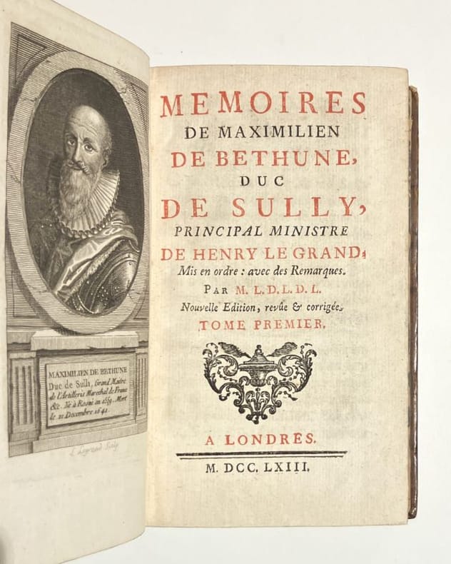 Londres, Londres1745 ; 3 volumes in-4, veau brun de l’époque. 2 ff., XXXVI pp., 596 pp. - 2 ff., X pp., 664 pp., 1 f. errata - 2 ff., VI pp., 563 pp. (1 p. errata).Édition donnée par l’abbé de l’Écluse. “Elle est d’une lecture plus agréable que la première” Brunet. L’édition originale a été imprimée en 1638 sur la presse privée du château de Sully-sur-Loire. 2 portraits (Henry IV et Sully) hors-texte au tome 1. Certains exemplaires contiennent une suite de 56 ou 58 portraits. Chaque tome porte l’ex-libris gravé de la bibliothèque Voyer de Paulmy d’Argenson. Reliures usagées, coiffes, coins et charnières abimés.