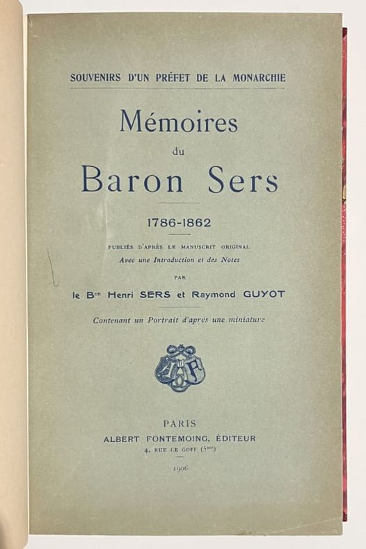 Édition originale de ces souvenirs d'un haut fonctionnaire de l'Empire et de la Monarchie, publiés par le baron Henri Sers et l'historien Raymond Guyot. Portrait de l'auteur en frontispice. « Le baron Sers, de confession protestante, servit Napoléon et la Restauration comme sous-préfet puis préfet, mais sa sympathie allait plutôt à Louis-Philippe, auquel il se rallia avec enthousiasme en 1830. Ses souvenirs sont précis et de bonne qualité. Outre les nombreuses informations qu'on peut y glaner sur la haute société de Bordeaux, sa ville natale, on y trouvera des renseignements sur la vie des départements qu'il administra : Bas-Rhin (il fut sous-préfet de Wissembourg en 1814-1815), Haut-Rhin, et surtout Cantal, où il dirigea l’administration départementale de 1820 à 1828. Il était préfet à Clermont-Ferrand lors de la chute de Charles X » (Bertier de Sauvigny & Fierro). Bel exemplaire bien relié.