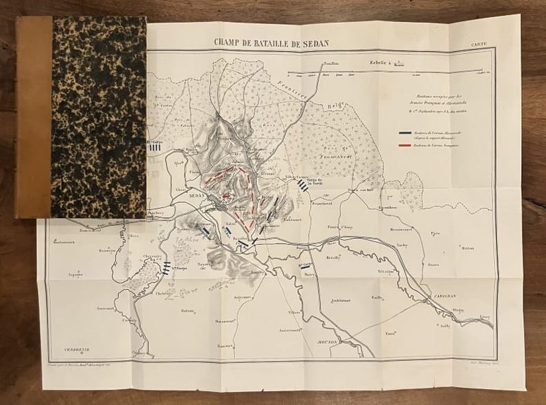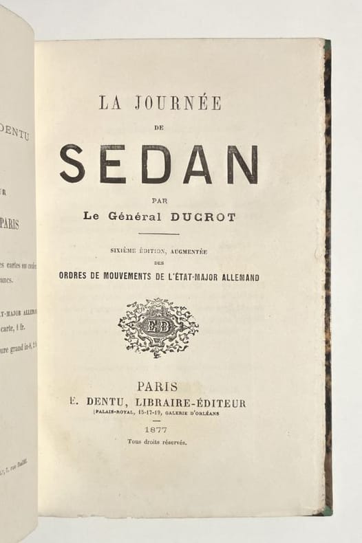 Dentu Paris, E Dentu libraire éditeur, 1877. In-12 broché de 144 pages. 3 grandes cartes dépliantes : Environs de Sedan, Champ de bataille de Sedan positions occupées le 31 aout, champ de bataille de Sedan positions occupées le 1er septembre. (une carte ayant une petite déchirure sans manque). Déchirure sur le haut et bas du dos, signature d'appartenance à la couverture. Sixième édition augmentée des ordres de mouvements de l'Etat Majot allemand et de Trois cartes en couleurs.