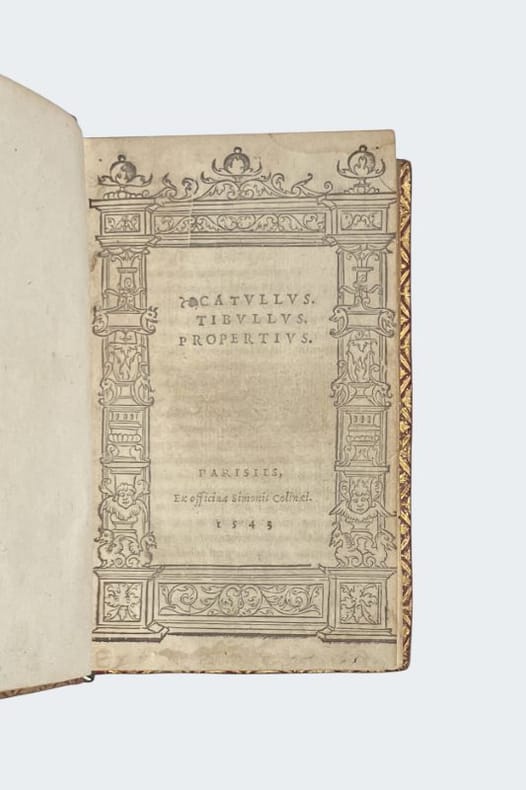 Jolie édition ancienne de petit format, imprimée en caractères italiques et ornée d'un titre à encadrement. Elle reprend les éditions données par le même Simon de Colines en 1529 et 1534. La vie de chacun des trois poètes élégiaques, extraite de Crinitus, précède ses oeuvres en latin. Bon exemplaire en maroquin rouge du XVIIIe siècle. Reliure un peu frottée, petites mouillures marginales, piqûre de rouille au f. 20. Le titre a été lavé.
