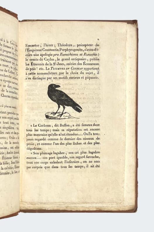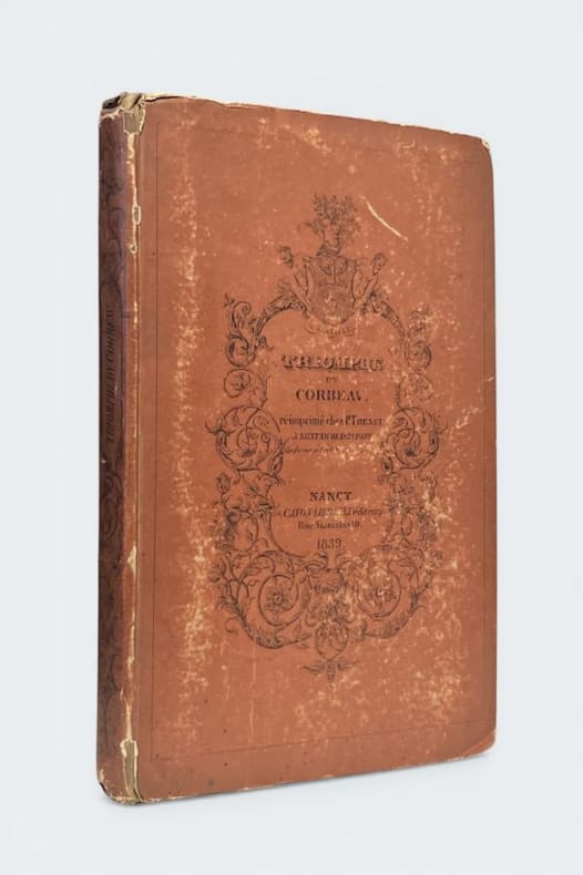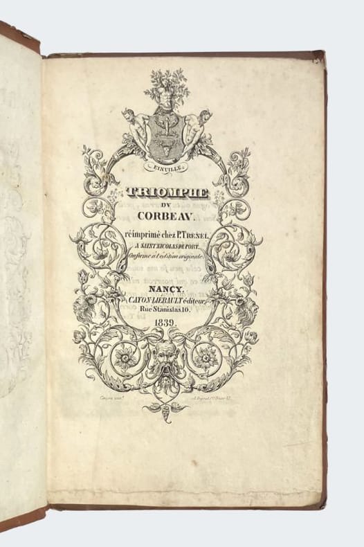 Réimpression soignée d'une curieuse défense du corbeau publiée à Nancy en 1619. Antoine Uzier était curé d'Einville-au-Jard, près de Lunéville, où se trouvait une résidence de chasse des ducs de Lorraine envahie par des nuées de corbeaux. Dans un langage fleuri, il réfute un à un les défauts associés à cet oiseau – couleur, voix, haleine, bec courbé... – et prétend au contraire qu'il faut y voir un messager divin protecteur de la maison de Lorraine. Tirage à petit nombre, dédié par Cayon à la Société des Bibliophiles françois. Le texte est agrémenté d'un titre gravé et de 3 vignettes représentant l'église d'Einville, un corbeau et les armoiries de la maison de Lorraine. Belle marque de l'éditeur sur le dernier feuillet, à la manière des impressions anciennes. Exemplaire conservé dans son joli cartonnage illustré d'éditeur. Frottements, usures aux extrémités. Brunet, V, col. 1024. Beaupré, Recherches sur les commencements de l'imprimerie en Lorraine, pp. 329-330 : « Le seul reproche, si c'en est un, qu'on puisse faire à cette réimpression, c'est d'être beaucoup trop belle, comparativement à l'édition originale, dont elle est l'exacte copie. »
