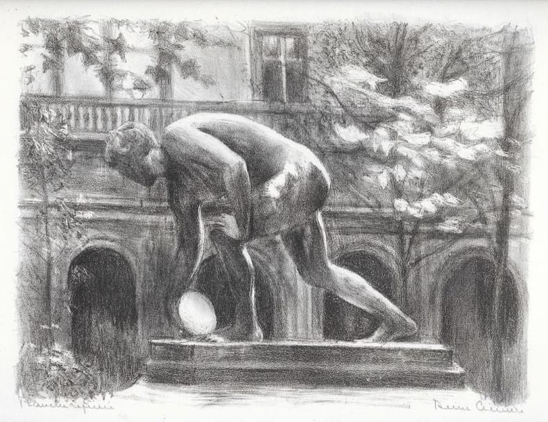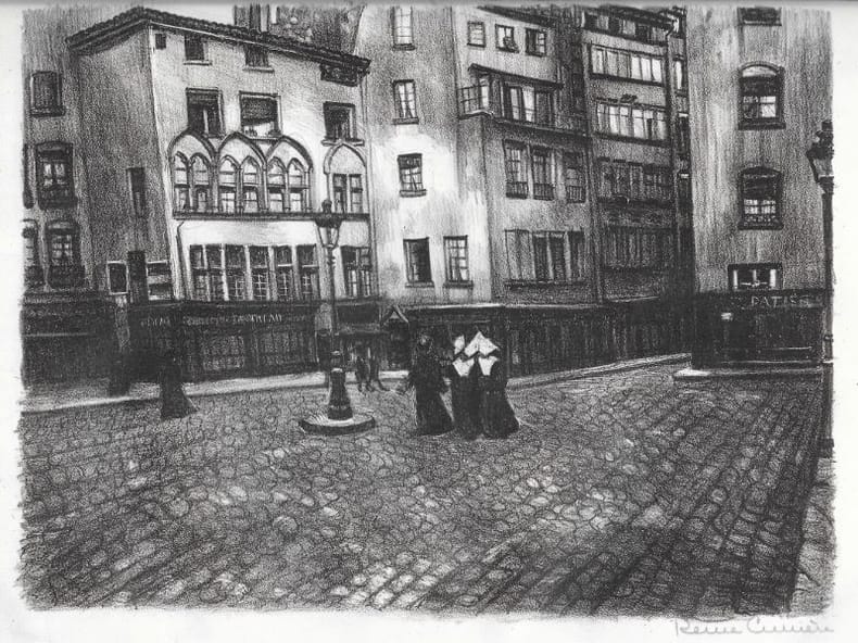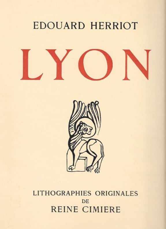 Texte du président Herriot, accompagné de 18 lithographies originales de Reine Cimière dont 16 vues à pleine page : l'impasse Turquet, le pont de la Guillotière, la rue du Vieil-Renversé (Saint-Georges), la place du Change, la basilique Saint-Martin d'Ainay, le marché du quai Saint-Antoine, le parc de la Tête d’or, etc. Tirage limité à 150 exemplaires, celui-ci UN DES 10 SUR JAPON IMPÉRIAL avec une suite des lithographies et une planche refusée sur papier de Chine, signées au crayon par l'artiste. Il manque à la suite la Vue du port et les Brumes sur la Saône. Bon exemplaire. Étui usé.