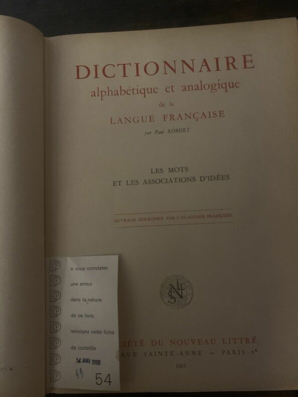 Paul Robert Dictionnaire alphabétique et analogique de la langue française Les mots et les associations d'idées Tomes 1 à 6 Paris, Littré 1965 6 volumes reliés format : 31 x 23 cm