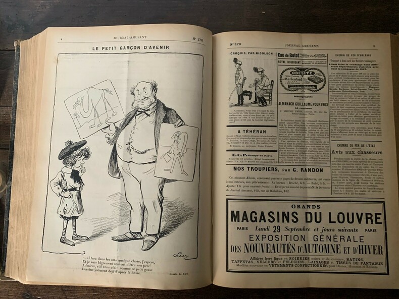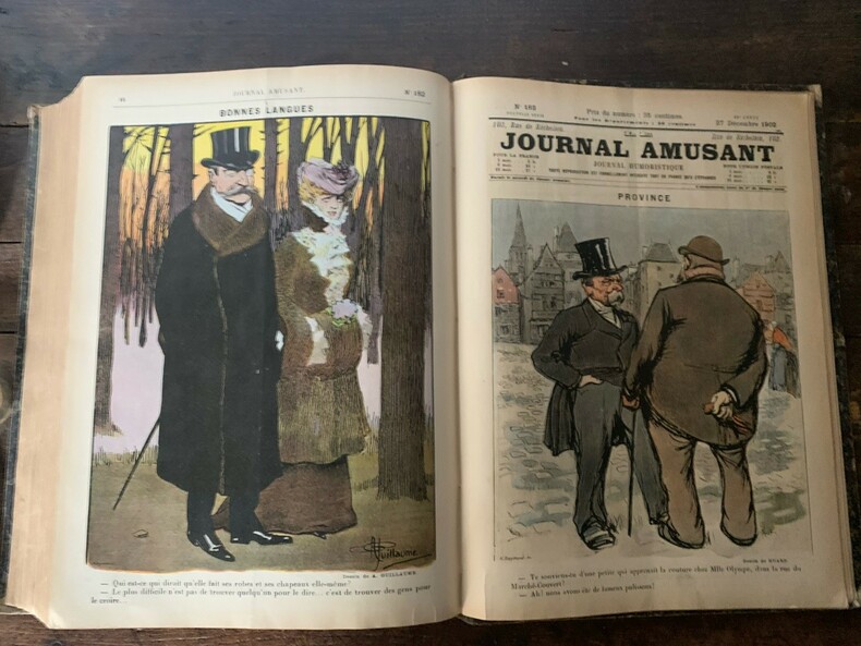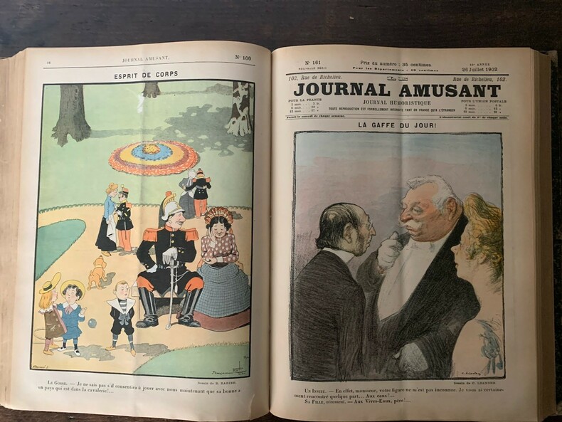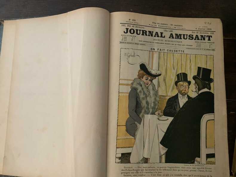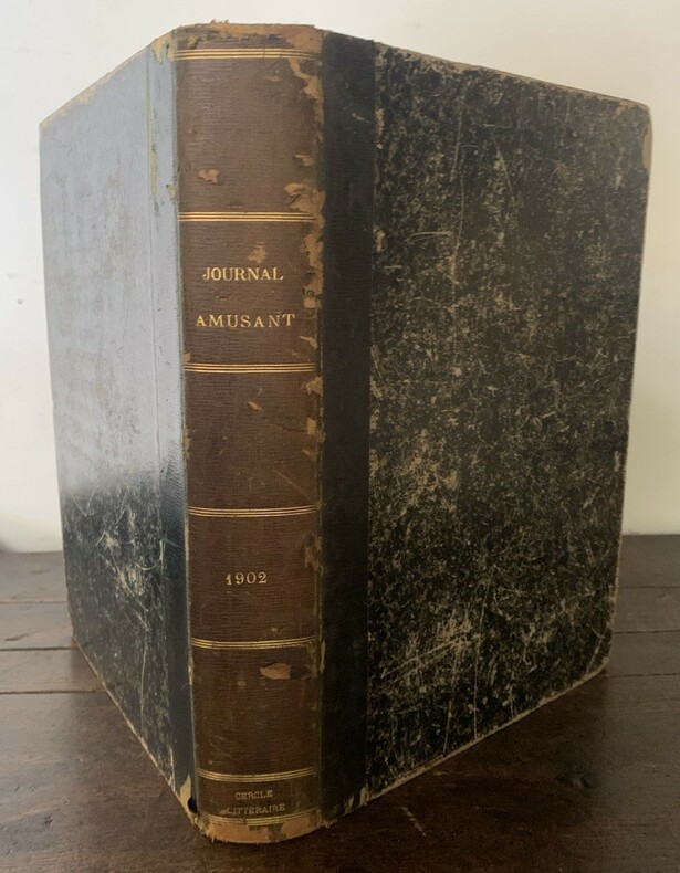 Le Journal amusant 55ème année 1902 52 numéros (couvertures et 4èmes de couverture en couleurs) format : 34 x 25.5 cm chaque numéro : 16 pages Du numéro 132 (4 janvier 1902) au numéro 183 (27 décembre 1902) Nombreux dessins de Gerbault, Lourdey, Bac, Léandre, Rabier, Dorville, Mars, Préjelan, Métivet (sous le pseudonyme de Luc) , Huard, Josias, Henriot, Guillaume, Gottlob, Draner, Baric, Crafty... Une des meilleures années du journal amusant, complète et reliée