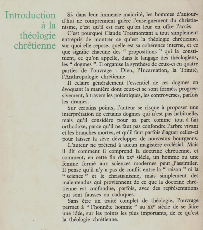 Claude Tresmontant Introduction à la théologie chrétienne Paris, Seuil 1974 1 volume broché format : 20.5 x 14 cm 694 pages
