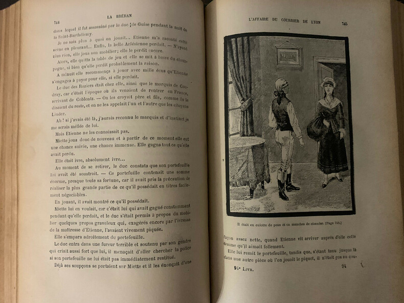 Marc Mario La Bréban ou l'affaire du Courrier de Lyon Grand roman judiciaire & inédit Paris, Edinger, sans date (vers 1884 2 volumes reliés format : 28 x 19 cm 2414 pages illustrées Complet et rare ! Madeleine Bréban était la maîtresse de Courriol, un des assassins guillotinés. Elle a joué un rôle étrange dans cette tragédie qui emmena à l'échafaud Lesurques qui était probablement innocent. C'est ce que ce roman populaire tente de démontrer avec brio et précision.