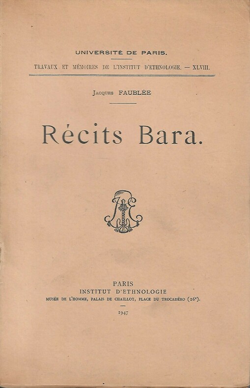 Jacques Faublée Récits Bara Paris, Institut d'ethnologie de Paris 1947 1 volume broché format : 28 x 18.5 cm 537 pages