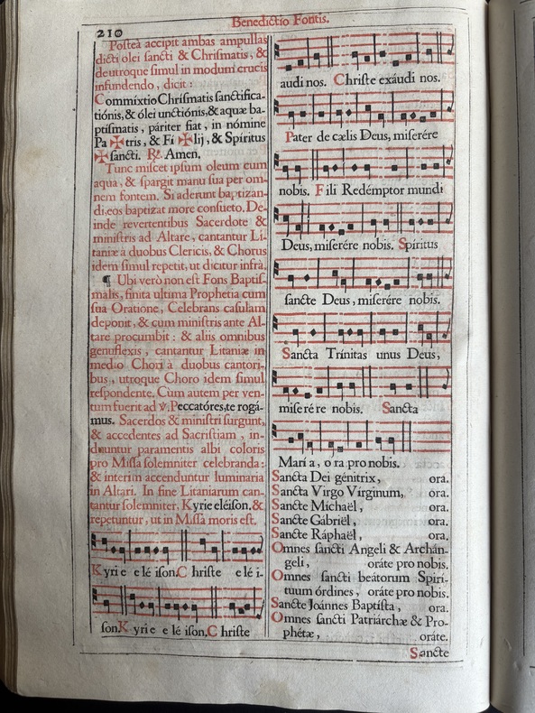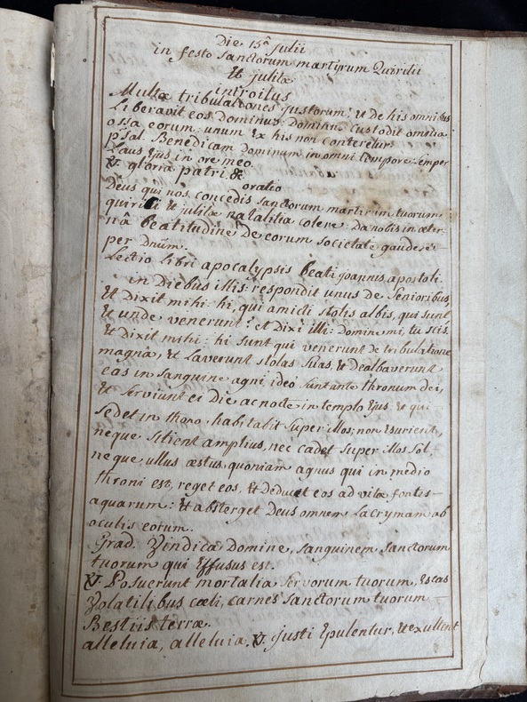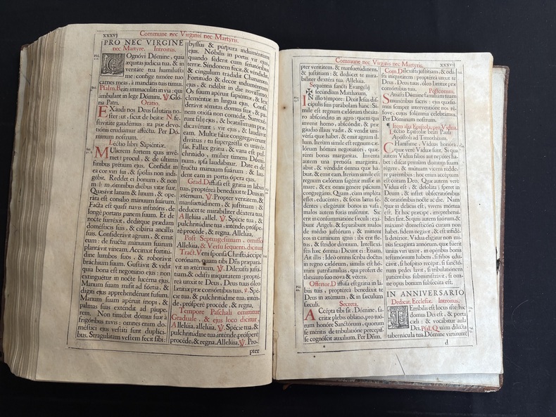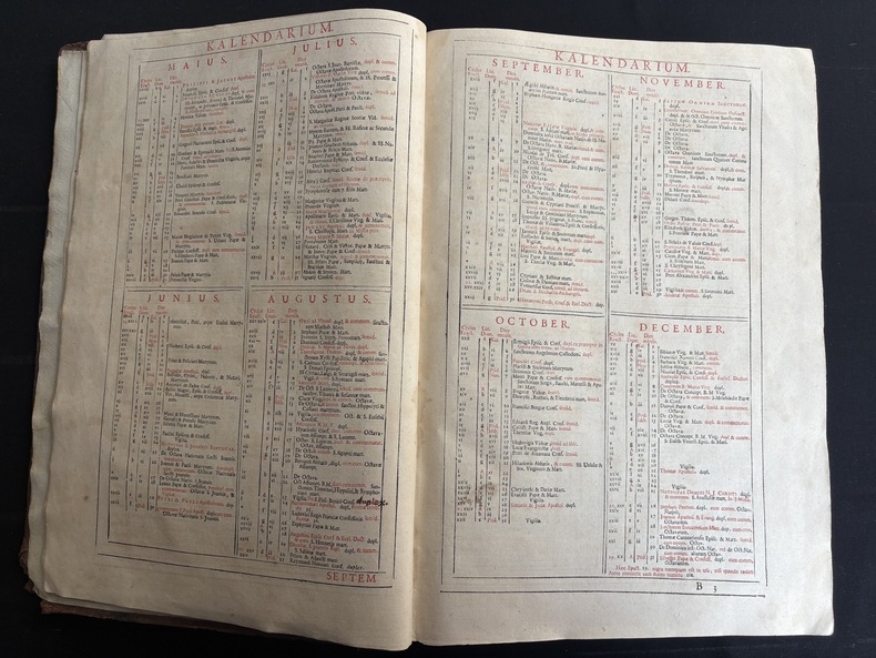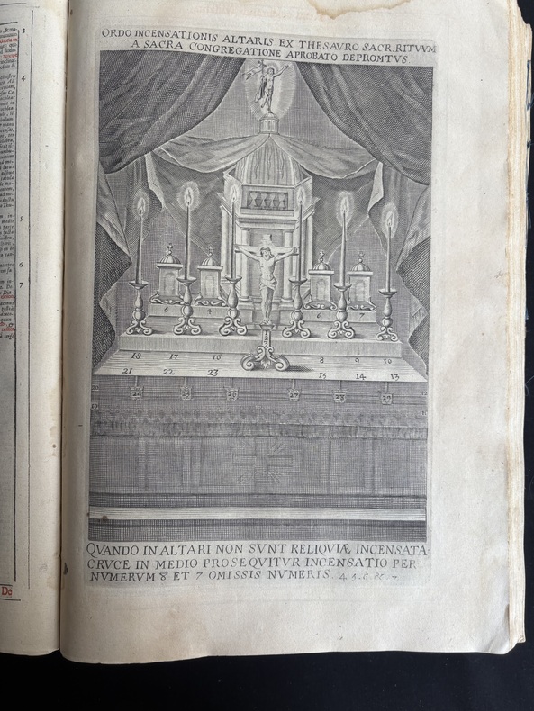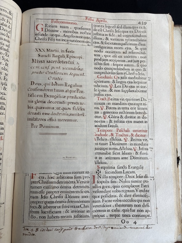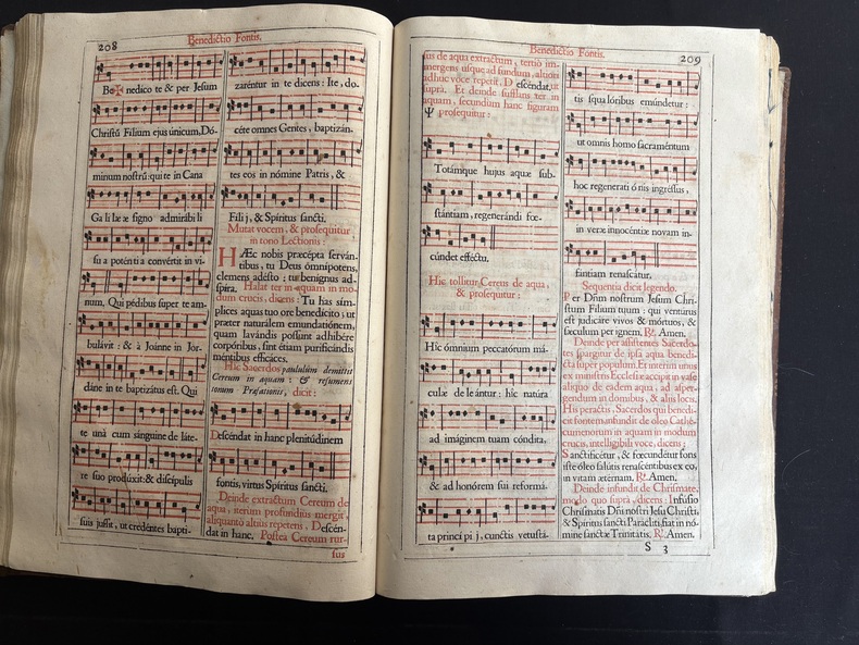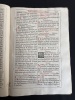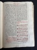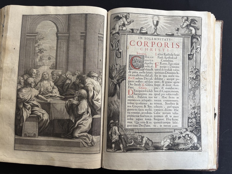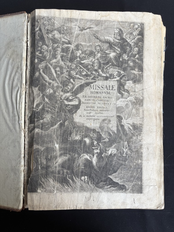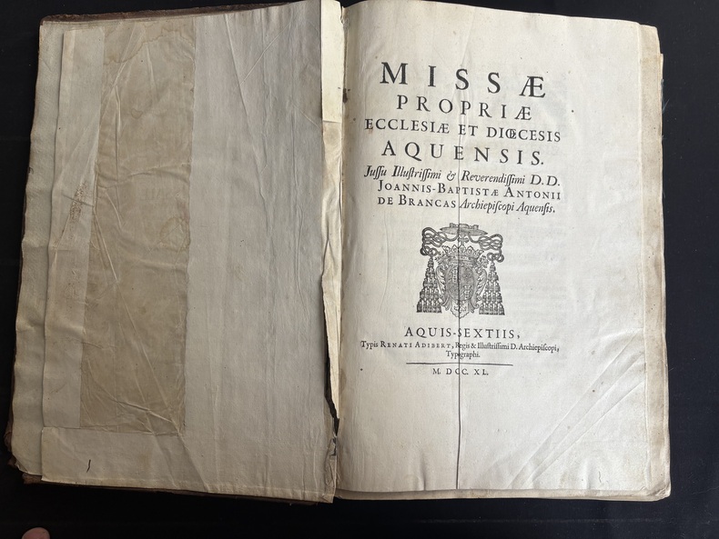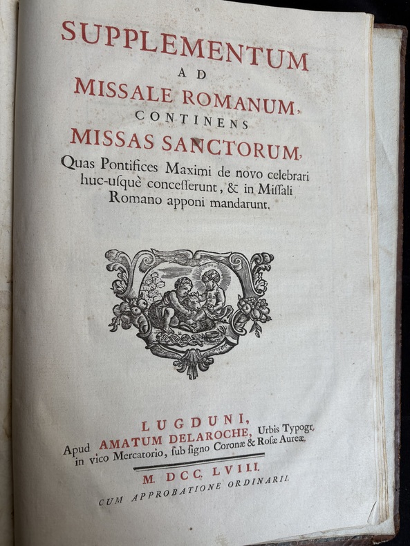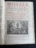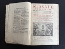 Lugduni [Lyon], Ex Typographia Petri Valfray, 1696. In-folio (env. 38 x 26 cm). Reliure de l’époque en plein veau marbré, dos à nerfs orné de fleurons et caissons dorés, encadrement de roulettes dorées aux plats (motifs de pampres de vigne), tranches jaspées. Reliure solide mais marquée : mors fendus par endroits, coiffes arasées, coins usés, dorure atténuée ; intérieur d’un bel état d’usage liturgique ancien. Contenu du volume (recueil composite liturgique, complet) : 1. [Frontispice gravé], spectaculaire composition baroque représentant Dieu le Père en gloire, la tiare papale et les clefs de Saint-Pierre, entourées d’anges et de figures allégoriques. 2. MISSÆ PROPRIÆ ECCLESIÆ ET DIOECESIS AQUENSIS, Aquis-Sextiis [Aix-en-Provence], Typis Renati Adibert, 1740. 20 pp. — Supplément diocésain imprimé placé en tête du volume, conforme à l’usage du clergé d’Aix. 3. MISSALE ROMANUM, Lugduni, Petri Valfray, 1696. Texte en rouge et noir, nombreux bois et lettrines, musique notée sur portée carrée. XXX; 556 pp., suivie d’un appendice en chiffres romains (116 pp., Index 4 pp. Édition post-tridentine typique de la production lyonnaise de Valfray, illustrée d’un grand soin typographique. 4. SUPPLEMENTUM AD MISSALE ROMANUM, Lugduni, apud Amatum Delaroche, 1758., 32 pp. — Ajout officiel postérieur, contenant les messes nouvelles instituées après 1696. 5. Cahier manuscrit (6 pages in fine), en latin, de belle main régulière du XVIIIᵉ siècle, ajoutant plusieurs messes ou collectes locales (probablement fêtes propres d’un saint ou d’une paroisse provençale). Particularités : – Volume authentiquement composite, résultat d’un usage sacerdotal prolongé sur plusieurs décennies (1696–vers 1780). – Annotations manuscrites ponctuelles dans le corps du Missale Romanum (renvois, corrections, ajouts de fêtes). – Présence du Supplément diocésain d’Aix (1740) et du Supplément universel (1758), attestant la mise à jour liturgique constante. – Le cahier manuscrit final, original, confère une dimension de document d’usage personnel rare et recherchée. Contexte historique : Le Missale Romanum de Valfray (Lyon) s’inscrit dans la tradition des éditions post-tridentines approuvées par Rome. Les imprimeurs lyonnais, réputés pour la qualité de leur typographie liturgique, fournissaient les autels de France entière. Ce volume, enrichi de suppléments imprimés et manuscrits, reflète la continuité d’un usage liturgique local dans le diocèse d’Aix au XVIIIᵉ siècle — un exemplaire vivant, témoin direct du travail quotidien d’un prêtre provençal. État : Bon exemplaire, en reliure d’époque authentique et solide malgré les frottements et fentes de mors ; intérieur propre, quelques rousseurs éparses, traces d’usage conformes à un livre d’autel. Suppléments bien conservés, manuscrit lisible. Manques pages 533-536, quelques pages restaurées Exemplaire composite rare et de belle cohérence, réunissant un Missale Romanum de 1696 et ses mises à jour imprimées et manuscrites du XVIIIᵉ siècle — précieux témoignage d’usage liturgique provençal.
