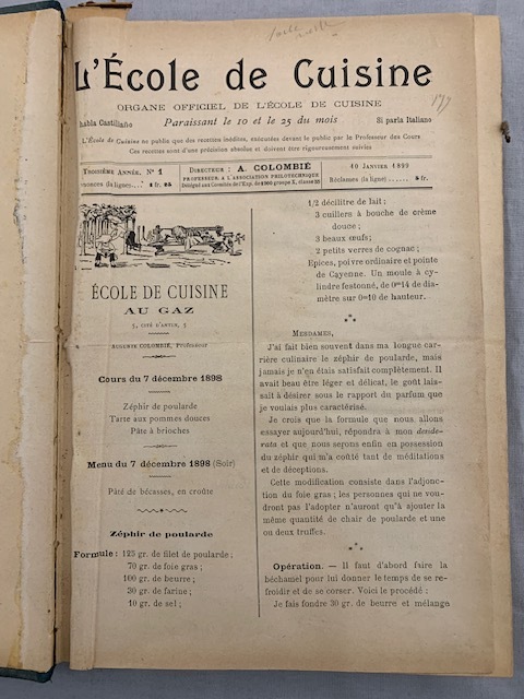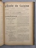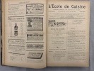 Relié. Couverture et quatrième couverture état d'usage, intérieur bon, première page détachée. 384 pages, 19x27,2 cm Troisième année. Du No 1 10 janvier 1899 au No 24 25 décembre 1899. L'École de Cuisine ne publie que des recettes inédite, exécutées devant le public par le Professeur des Cours. Ces recettes sont d'une précision absolue et doivent être rigoureusement suivies