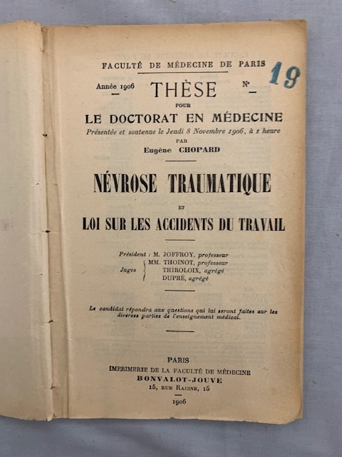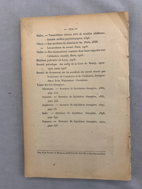Paris, Imprimerie de la Faculté de Médecine Bonvalot-Jouve, 1906. Broché sans couverture. 112 pages. 14,7x22,5 cm. Etat correcte
