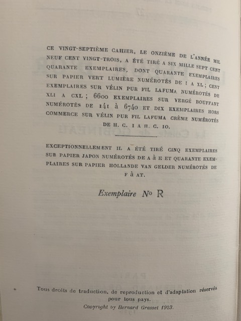 Paris, Grasset, 1923. Edition originale. Broché. 140 pages. 12,2x19 cm. Un des 40 exemplaires sur papier Holland van Gelder. Exemplaire No. R. Exemplaire non coupé. Tâches première page, sinon bon état