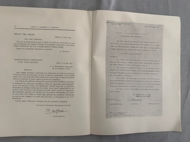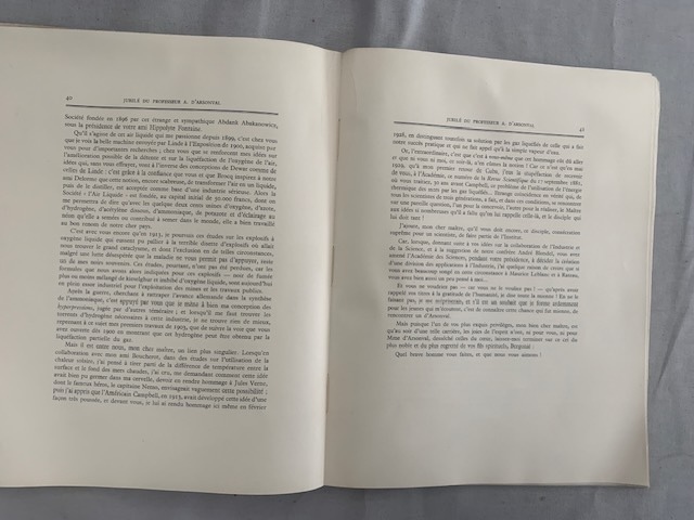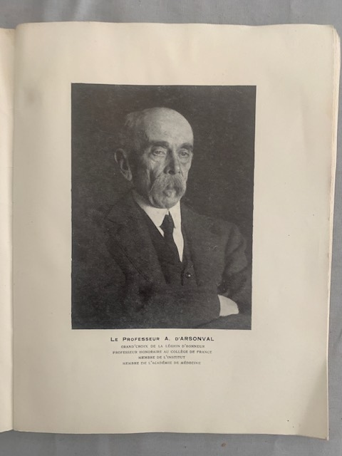 sans lieu, sans éditeur, 1933. Broché. 98 pages. Avec photos et documents en noir et blanc. 21x27 cm. Couverture et dos avec taches, intérieur bon état Le Jubilée du professeur d'Arsonval a été célébré dans le grand amphithéâtre de la Sorbonne, sur l'initiative de la Renaissance Française, en présence de M. Albert Lebrun, président de la République, et sous la présidence de M. de Monzie, ministre de l'Éducation Nationale. Jacques Arsène d'Arsonval, né le 8 juin 1851 à La Porcherie (Haute-Vienne) et mort le 31 décembre 1940 dans la même commune, est un médecin, physicien et inventeur français. On lui doit notamment le galvanomètre balistique, le premier téléphone agréé par les PTT et des études sur l'électrothérapie par les courants à haute fréquence.