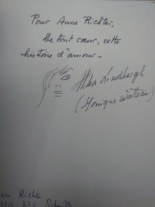 1986 Bruxelles, Jacques Antoine, 1986. 20,5 x 13,8 cm, 287 pp. Broché, couverture rempliée. Couverture légèrement salie sinon bon exemplaire. Envoi autographe signé de Monique Watteau, pseudonyme d'Alika Lindbergh, romancière et peintre belge, à Anne Richter, avec un dessin.