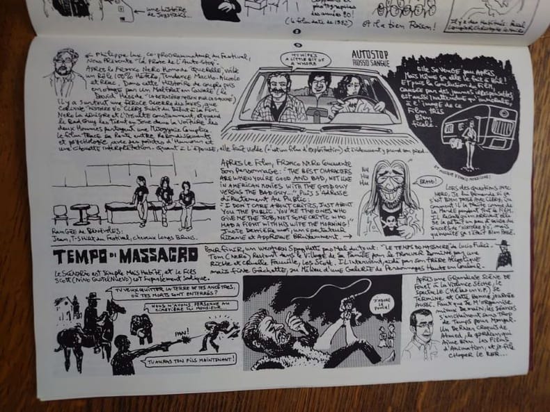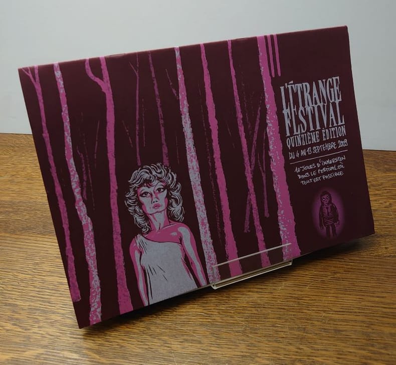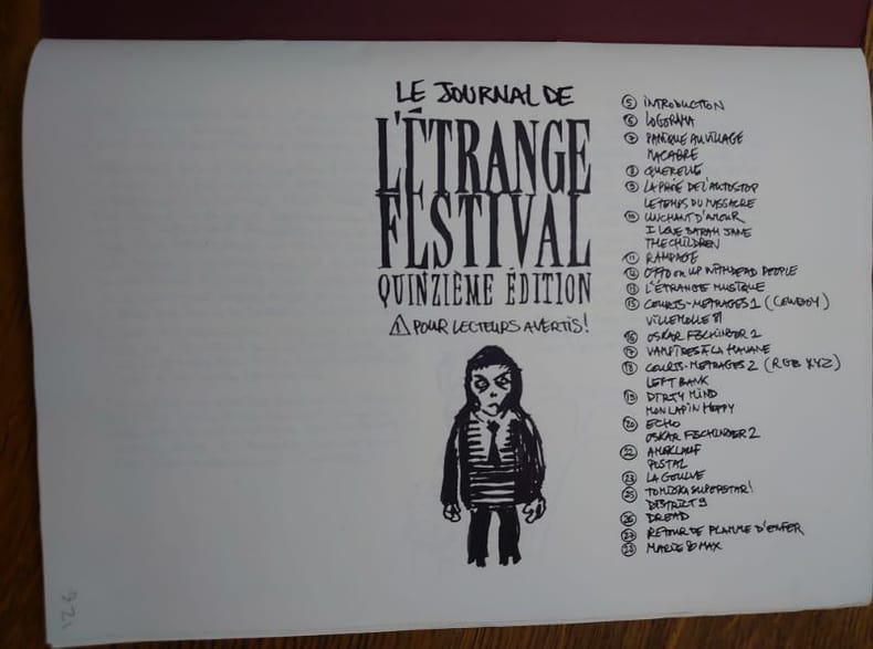 Le Journal de l'Etrange Festival est un fanzine de 32 pages à couverture originale sérigraphiée, tiré à 100 exemplaires numérotés, achevé par l'artiste Paul Poutre en janvier 2010. Il s'agit d'un compte-rendu dessiné, en noir et blanc, de la quinzième édition du festival parisien l'ETRANGE FESTIVAL, qui s'est tenu en septembre 2009 à Paris. Le fanzine mélange critiques de films, anecdotes, portraits de spectateurs, interviews d'organisateurs, coulisses, croquis d'ambiance etc. Bel exemplaire.