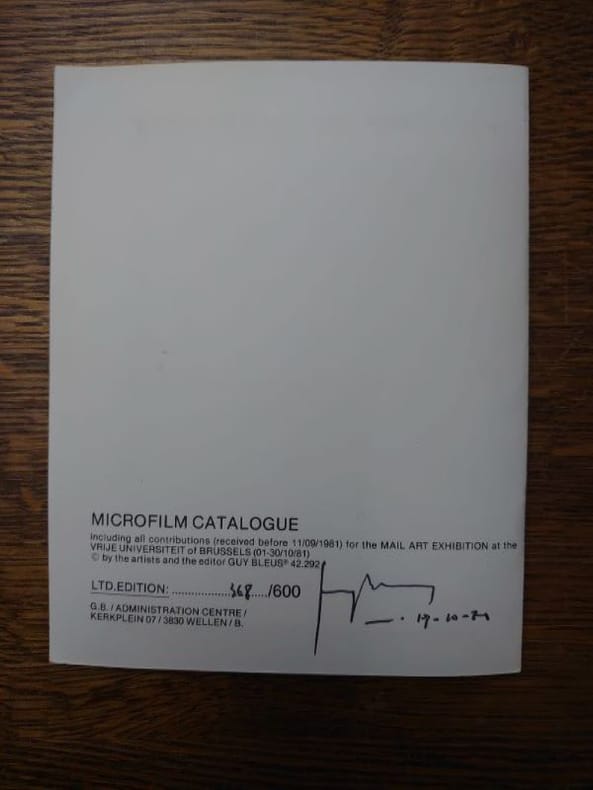 G.B. / Administration Center, Wellen / Belg, 1981. 17,5 x 14 cm, 20 pp. et 17 microfilms, en vrac dans deux pochettes intérieures. Ici le n° 368 des 600 exemplaires, signés de la main de Bleus. Bel exemplaire. Les microfilms documentent les travaux envoyés par des artistes du monde entier, le cahier imprimé est le répertoire correspondant. Robert Rehfeldt et d'autres artistes de la RDA y sont représentés, ainsi que Jürgen Olbrich, Staeck, Klaus Groh... Guy Bleus, né le 23 octobre 1950 à Hasselt (Belgique), est un artiste associé au mouvement mail art (art postal) et à l'art performance1. Il vit et travaille à Wellen, près de Liège.Son œuvre couvre différents domaines, y compris l'administration (qu'il appelle « Artministration »), la communication postale et les activités olfactives.