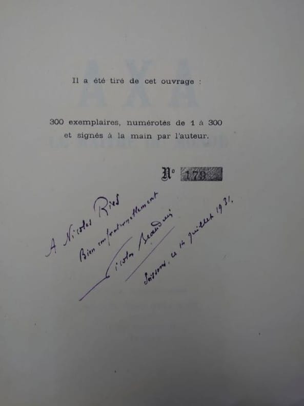1926 Paris-Neuilly, Éditions de La vie des lettres, sans date [1923]. 28,5 x 19 cm, 60 pp. Broché, bon exemplaire. Édition originale, un des 300 ex. num. Envoi autographe signé de l'auteur à Nicolas Ries, l’un des intellectuels francophiles luxembourgeois les plus en vue de la première moitié du XXe siècle.