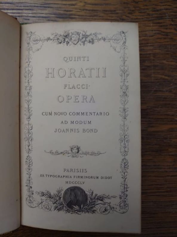 Horace, Quinti Horatii Flacci Opera. Cum novo commentario ad modum Joannis Bond. [Paris, Firmin Didot] Parisiis, Ex Typographia Firminorum Didot, 1855. In-16, [4]-XLVI-299p. Belle édition en petits caractères, exemplaire sur papier jonquille. Il y eut trois éditions différentes (voir Vicaire IV, 167-168), dont deux - dont la nôtre - avec les têtes de chapitres gravées sur bois par Huyot d'après les dessins de Barrias (et non photographiées). Notre exemplaire est donc un tirage avec le texte encadré d'un filet noir, avec les entêtes gravés sur bois. Vicaire en signale des exemplaires sur chine, papiers jaune, vert, vert d'eau et chamois. Notons que Didot mis un grand soin à cette édition et que la version avec les photographies, qui comporte - en plus - des hors-texte, est un des premiers livres illustrés par la photographie. Provenance : R de Nanteuil, avec une signature sur la couverture et la date 1871. On trouve un Roger de Nanteuil (1857-1951). Reliure signée Petit, successeur de Simier, demi-maroquin rouge à coins, dos à nerfs, tête dorée, couvertures muettes conservées (d'un jaune un peu plus intense). Un coin un peu écrasé. Exemplaire peu rogné (témoins encore visible en queue). Très bel exemplaire.