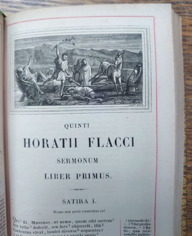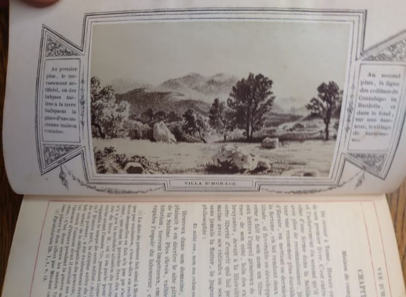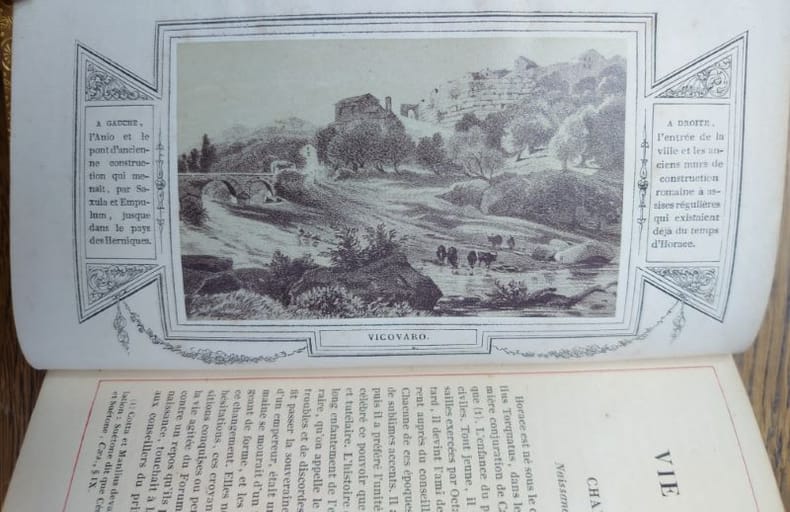 1855 Parisiis, Firmin Didot, 1855. 14 x 9 cm, (2) ff. ; XLVI pp. ; (1) f. bl. ; 299 pp. ; (1) p. bl. Relié plein veau, dos à nerfs, pièce de titre. Reliure très légèrement usée sinon bon exemplaire. Illustré, d'un frontispice, de 6 vues photographiques contrecollées : Vicovario, la Digentia, Fontaine de l'Oratini, villa d'Horace, Rocca Gionane, Mandela, et de nombreuses vignettes. L'un des tous premiers livres illustrés par la photographie.