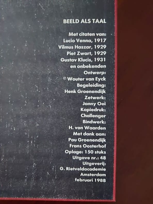 1988 G. Rietveldacademie, Amsterdam, 1988. 20,5 x 15 cm, non paginé. Relié pleine toile cartonnage d'éditeur. Bel exemplaire. Édition originale, tirage limité à 150 exemplaires.