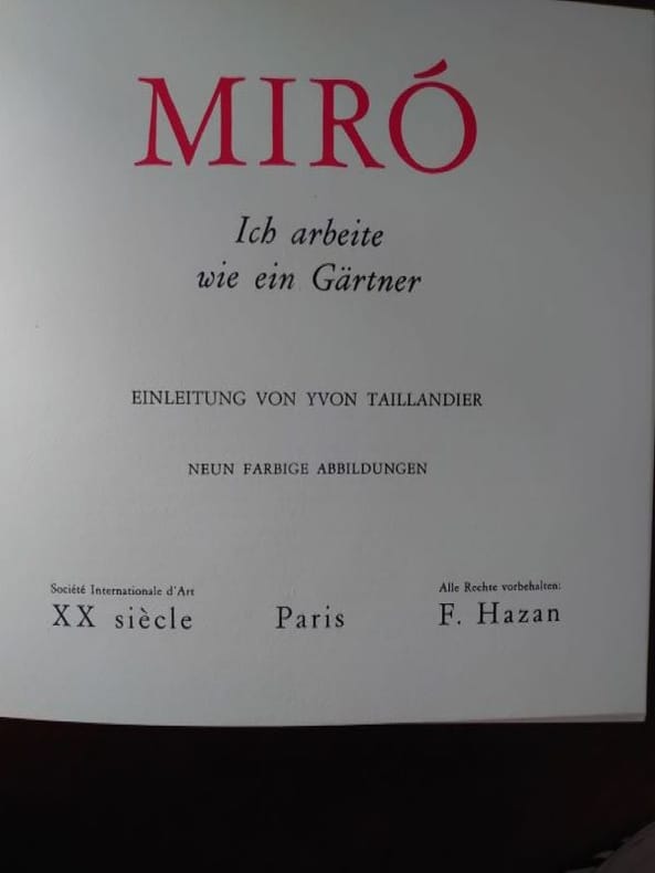 1964 Paris, Société International d'Art XX siècle, F. Hazan, 1964. 23 x 22 cm, 52 pp. Relié cartonnage d'éditeur illustré, très bel exemplaire. 9 reproductions d'oeuvres de Miro dont une à double page. Textes en allemand et en anglais.