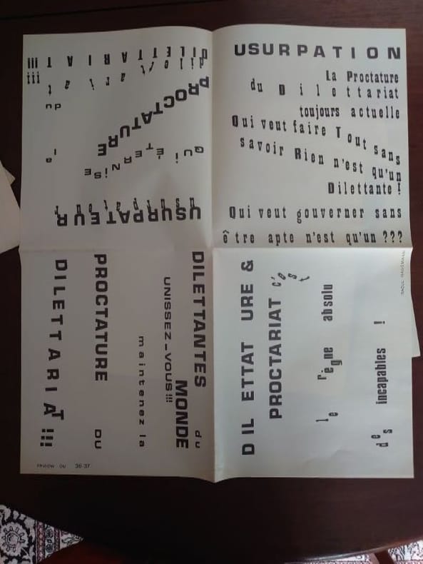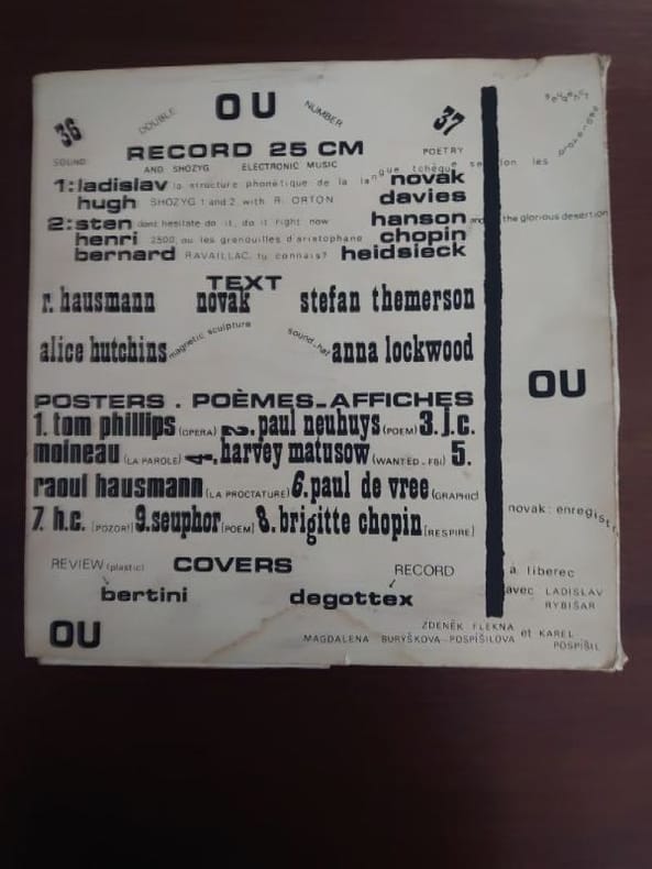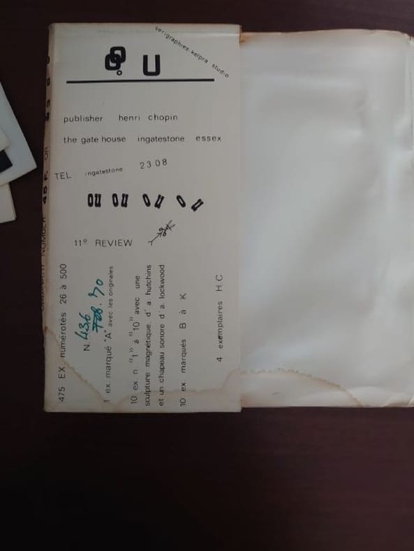 1973 Henri Chopin, The Gate house Ingatestone, 1970. 27 x 27, en feuilles sous chemise imprimée verso, et recto relief en plastique thermoformé (troué), 24 x 24 cm. Contient : un disque vinyle 33 tours, gardé dans papier cristal d'origine. Face A : Ladislav Novak, Hugh Davies. Face B : Sten Hanson, Henri Chopin, Bernard Heidsieck. Contient de plus des oeuvres graphiques ou textes de R. Hausman, Novoak, Stefan Themerson, Alice Hutchins, Anna Lockwood, Tom Philips, Harvey Matusow, Paul de Vree, Pozor, Brigitte Chopin.ATTENTION. Manque les oeuvres de Paul Nehys, J.C. Moineau et Michel Seuphor.Exemplaire numéroté, tirage limité à environ 500 ex. Chemise usée, trou dans le plastique thermoformé, petites déchirures sur les bords avec quelques rousseurs et mouillures sur la chemise.