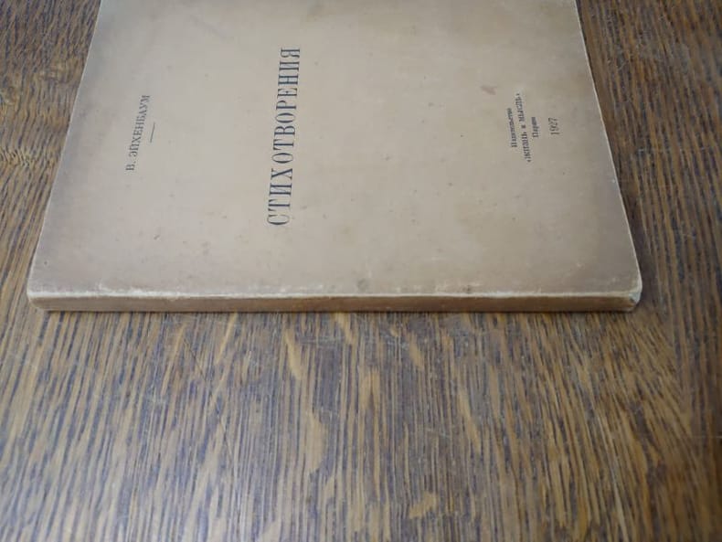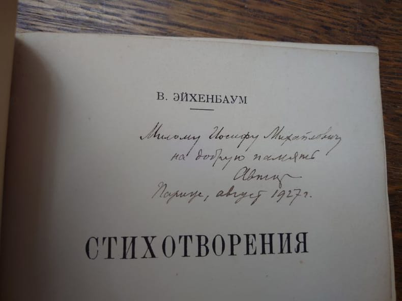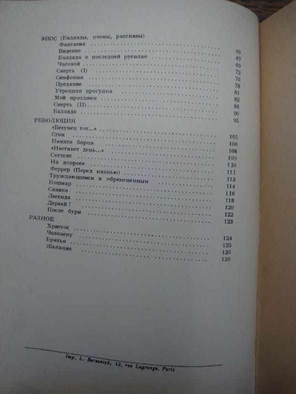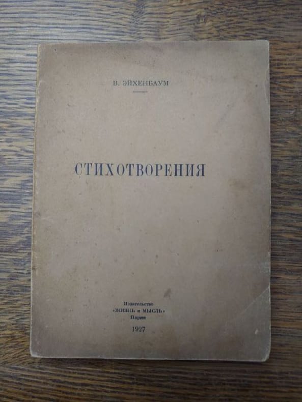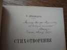 Париж, Издательство "Жизнь н Мысль" [Paris, Éditions « Vie et Pensée »] / J. Povolotzky et Co., 1927.18 x 13,5 cm, 126-[2] pp. Broché, couverture imprimée d’éditeur. Couverture passée, excellent état intérieur. Connu sous le nom de Voline (Bолин) à partir de 1905, Vsevolod Mikhaïlovitch Eichenbaum (1882-1945), militant et théoricien du mouvement anarchiste, fut aussi un poète. Il s’agit selon toute vraisemblance du seul ouvrage publié sous son vrai nom, et peut-être du seul recueil publié de ses poèmes. Il se compose de six parties : Лирика, На чужбине, 1914…, Эпос, Революция, Разное [Paroles, Dans un pays étranger, 1914…, Épique, Révolution, Divers].Exemplaire remarquablement conservé de cet ouvrage introuvable, avec un envoi autographe de l’auteur à un certain Joseph Miratlovitch (ou Mihkaïlovitch ?).