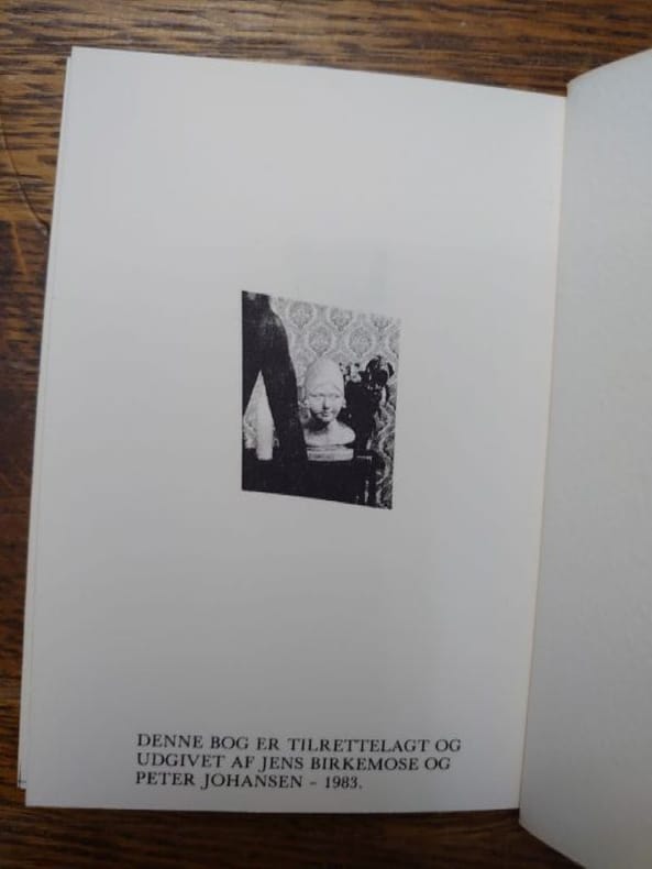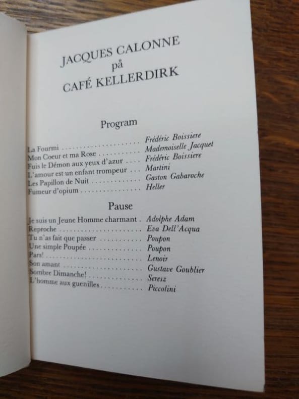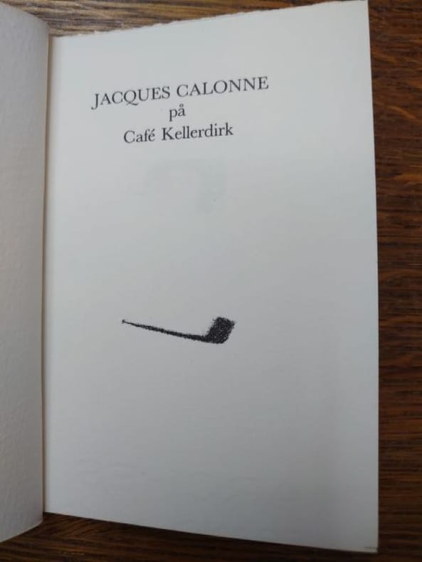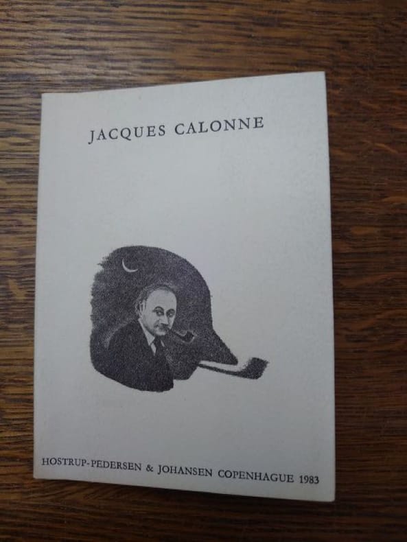 Hostrup-Pedersen & Johansen, Copenhague, 1983. 13,5 x 10 cm, non paginé. Broché, couverture légèrement poussiéreuse sinon bel exemplaire. Préface de Christian Dotremont en français. Jacques Calonne a donné huit récitals (Mélodies de salon) au Café Kellerdirk à Copenhague en 1983. Il s'agit ici de la traduction du programme par Inger Henningsen, illustrations de Jens Birkemose, avec une préface de Christian Dotremont (écrite en 1971).