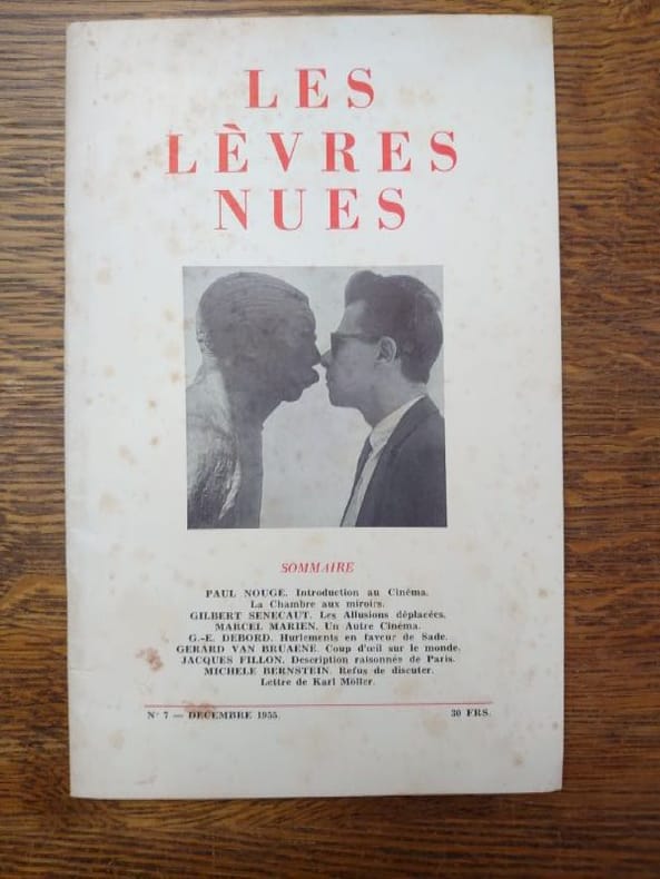 LES LÈVRES NUES. Bruxelles (28, rue du Pépin). Directeur : Marcel Mariën. Administration : Jane Graverol. In-8° agrafé. 12 numéros, dont un triple (le n° 10-12), ont paru en 10 livraisons, d'avril 1954 à septembre 1958, + un numéro hors série : " L'Imitation du Cinéma " (été 1960). (Aron & Soucy, 618) (Destribats, 588)