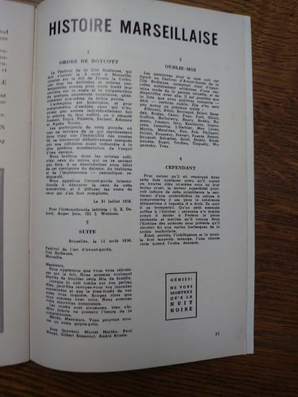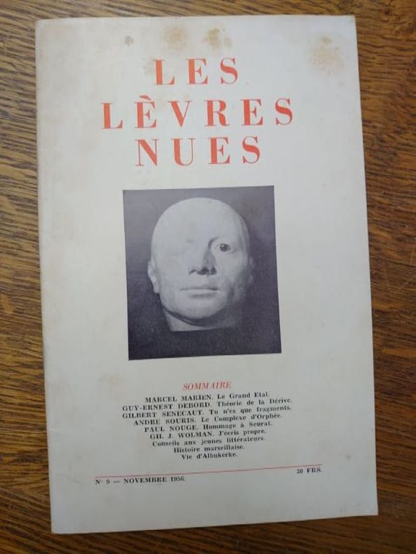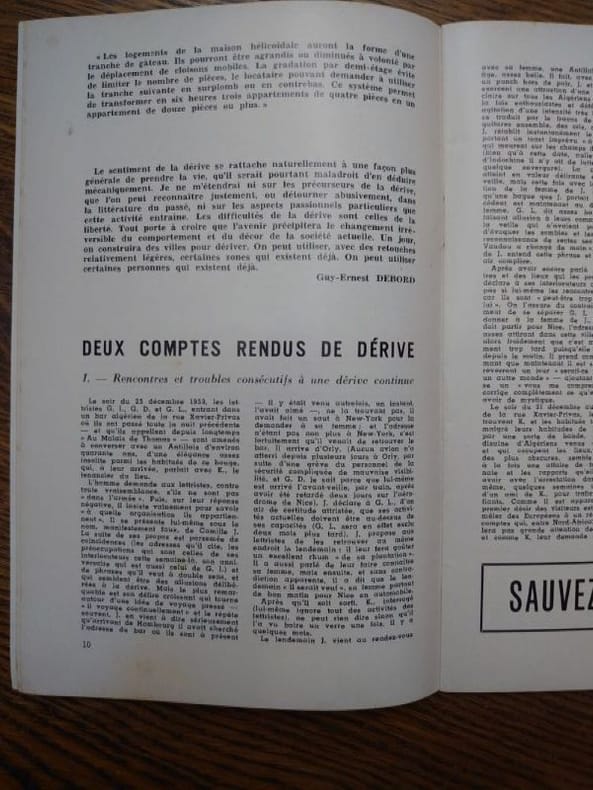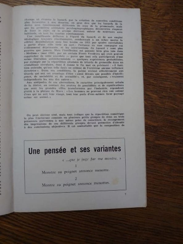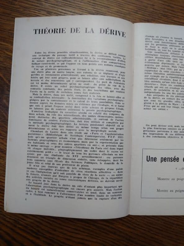 21,5 x 13,5 cm, 40 pp. Plaquette agrafée, couverture légèrement salie, quelques rousseurs, sinon bon exemplaire. Textes de Guy-Ernest Debord (Théorie de la dérive), Marcel Marien, Paul Nougé, Gil J. Wolman...