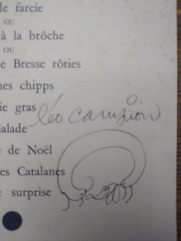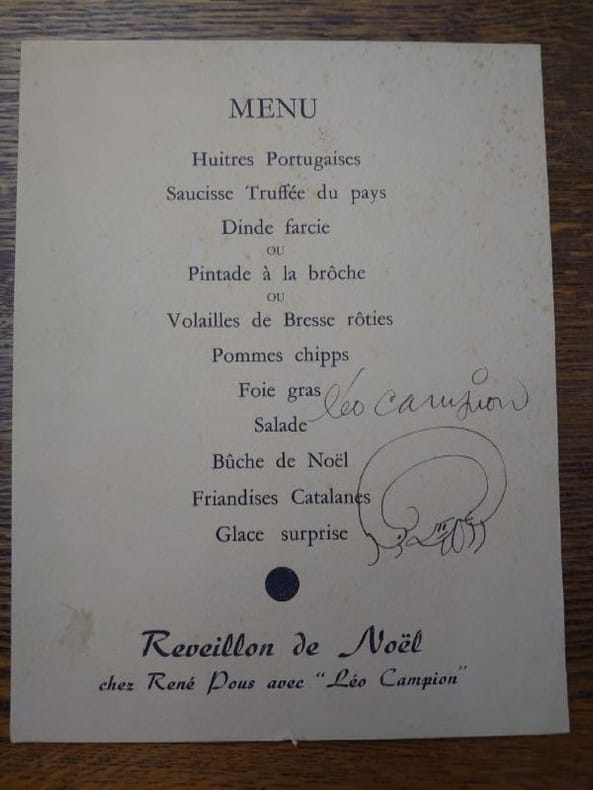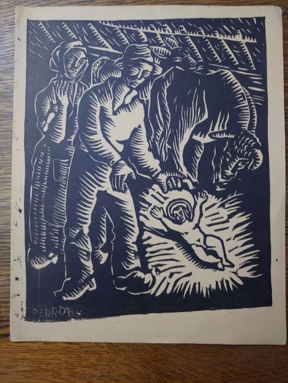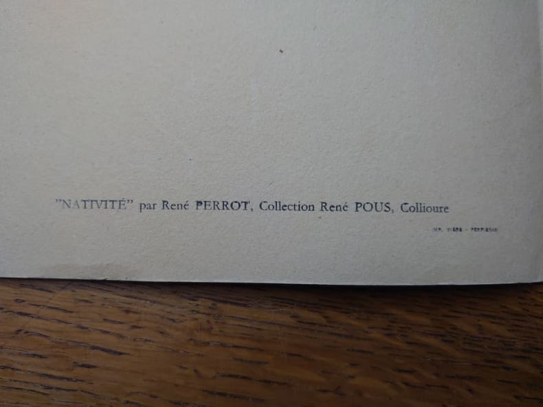 27 x 21 cm, un feuillet imprimé recto seul dans une chemise de quatre pages, couverture illustrée d'une gravure de René Perrot "Nativité", de la collection de René Pous. Bon exemplaire. Signature avec un dessin de Léo Campion.