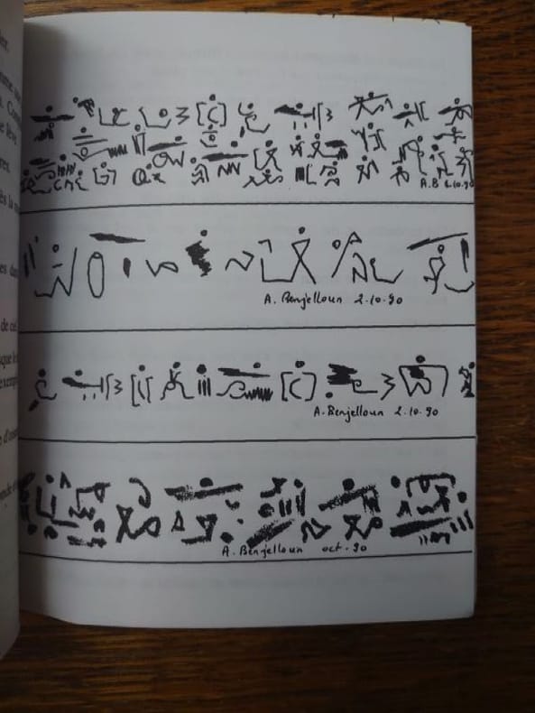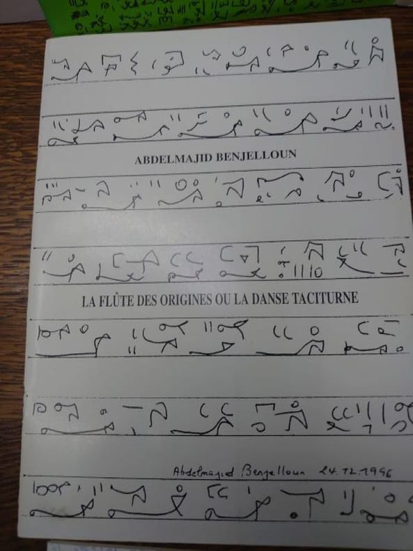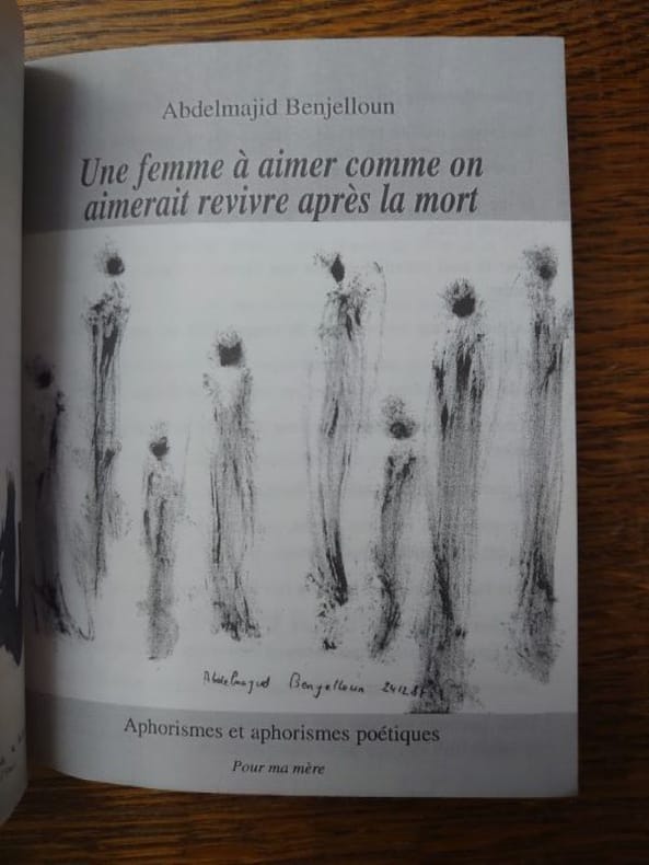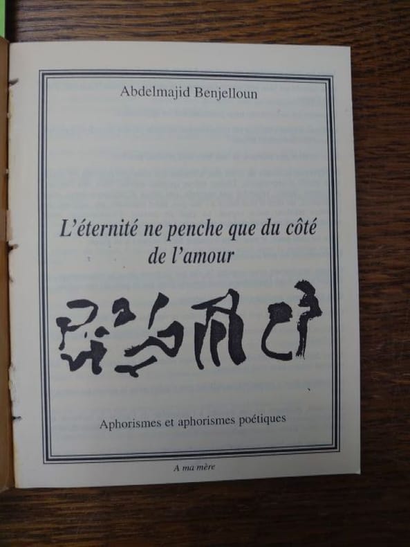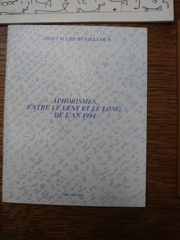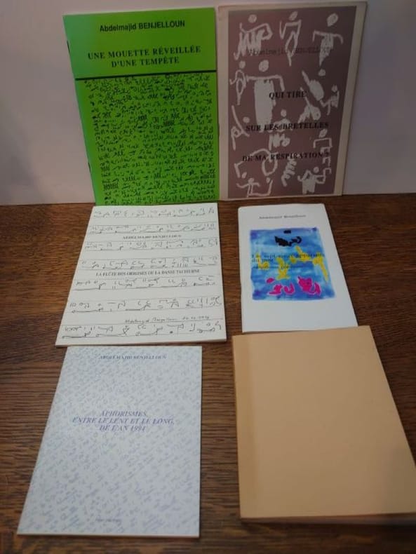 Nous avons : - Qui tire sur les bretelles de ma respiration. Rabat, 1989. Couverture illustrée par l'auteur. Plaquette, 32 pp. - Une mouette réveillée d'une tempête. Rabat, 1990. Couverture illustrée par l'auteur. Plaquette, 32 pp. - Les sept cieux apparents du mot. Aphorismes poétiques. Rabat, 1993. Couverture illustrée par l'auteur. Plaquette, 64 pp. - La flûte des origines ou la danse taciturne. Rabat, 1996. Couverture illustrée par l'auteur. Plaquette, 24 pp. - Aphorismes entre le lent et le long, de l'an 1994. Rabat, 2001. Couverture illustrée par l'auteur. Plaquette, 31 pp. Avec un recueil sous couverture muette de volumes aphorismes poétiques : L'éternité ne penche que du côté de l'amour. Le discobole amoureux... Une femme à aimer... L'amour rajeunit... Paroles déçues d'esplanade... Cette hébétude totémique avec elle. Tous les volumes sont en bon état.