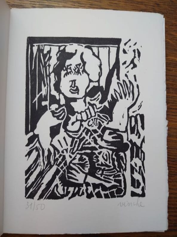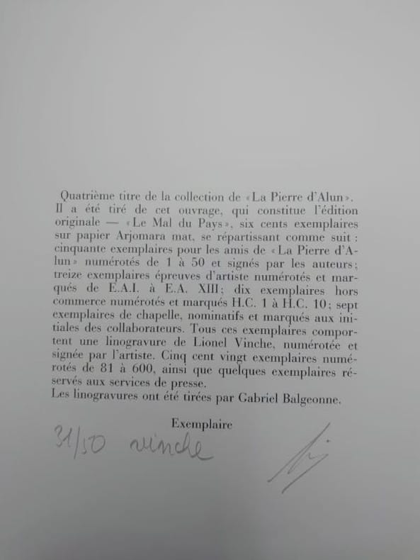 Bruxelles, La Pierre d'Alun, 1983. 22,5 x 16 cm, 60 pp. En feuilles sous chemise imprimée. Bel exemplaire. Édition originale, un des 50 exemplaires numérotés signés par les deux auteurs accompagné d'une linogravure originale signée de Lionel Vinche numéroté 31/50.