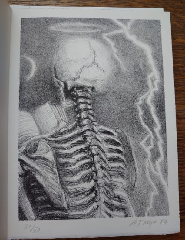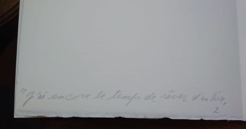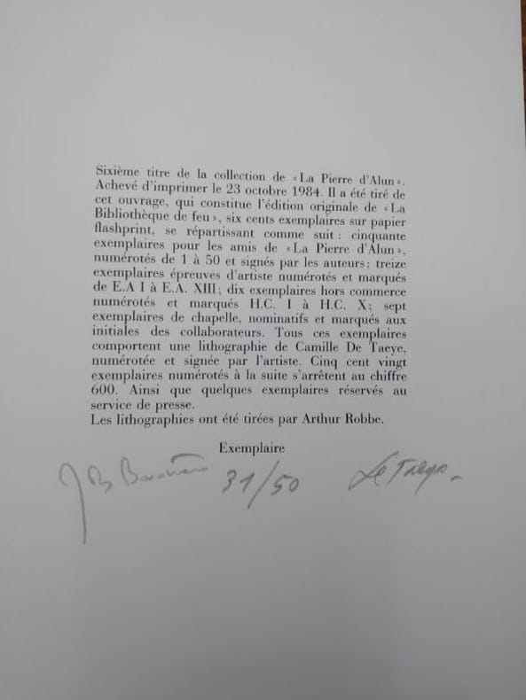 1984 Bruxelles, La Pierre d'Alun, 1984. 22,5 x 16 cm, 66 pp. En feuilles sous chemise imprimée. Bel exemplaire. Édition originale, un des 50 exemplaires numérotés signés par les deux auteurs accompagné d'une lithographie originale signée de Camille de Taeye numéroté 31/50.