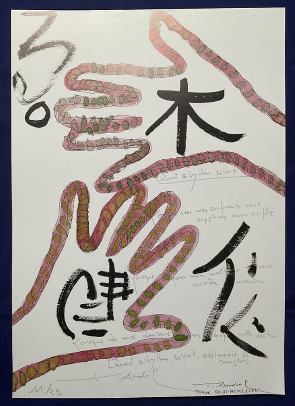 [Bruxelles, Lebeer-Hossmann, 1986]. 37,5 x 26,5 cm, impression offset et poème manuscrit. Oeuvre accompagnée d'un poème manuscrit signé de Fernando Arrabal, numérotée 11/25, datée du 20 novembre 1985 à Tokyo. Excellent état.