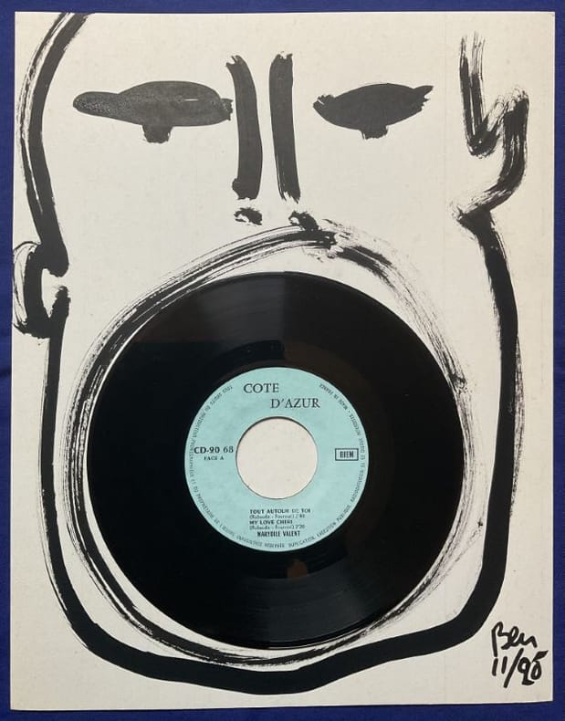 1985 1985. 37,5 x 26,5 cm, encre de Chine et disque contrecollé sur carton fin. Oeuvre originale datée et signée par Ben, numérotée 11/25 car elle fit partie du tirage de tête du porte-folio Cirque Divers édité par Lebeer-Hossmann en 1986. Excellent état.